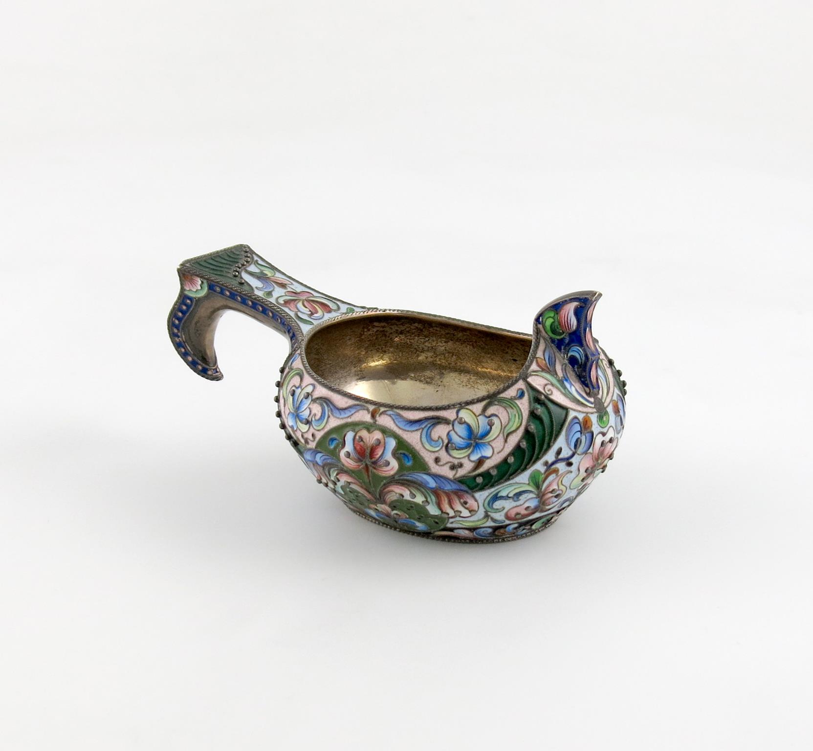 oval form, with vari-coloured enamelled decoration of flowers and foliate scroll decoration, twisted wirework borders, length 13.5cm.
