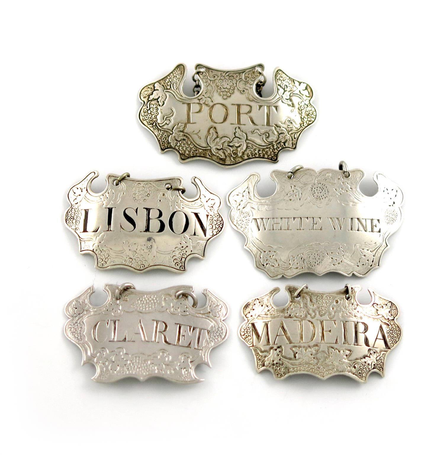 cartouche form, chased vine decoration, incised and blackened 'LISBON' and incised 'PORT', 'WHITE.WINE', 'MADEIRA' and 'CLARET', approx. weight 2oz. (5)