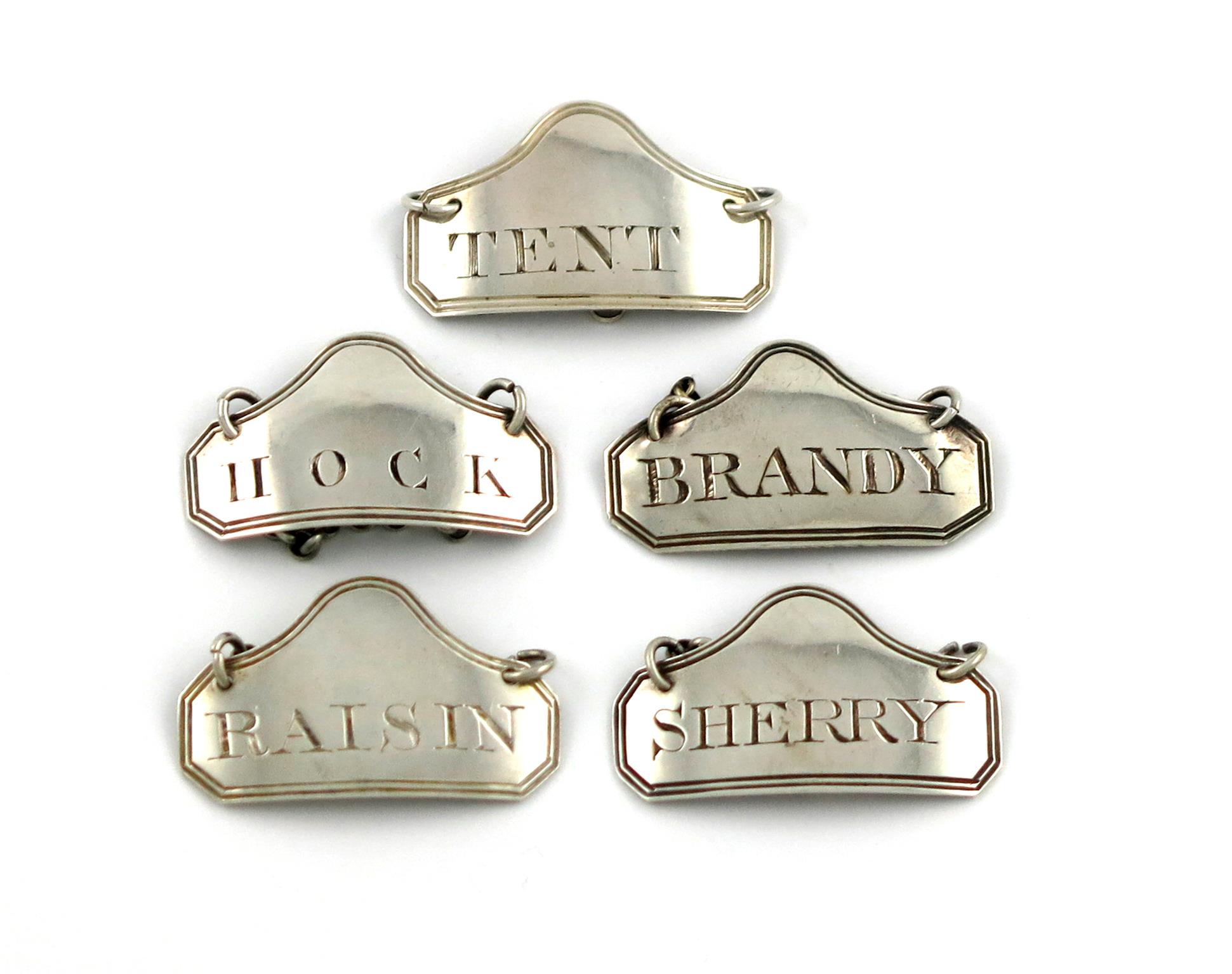 rectangular form, canted corners with a raised pediment, reeded borders, incised 'TENT', 'RAISIN', 'HOCK', 'BRANDY' and 'SHERRY', approx. weight 1oz. (5)