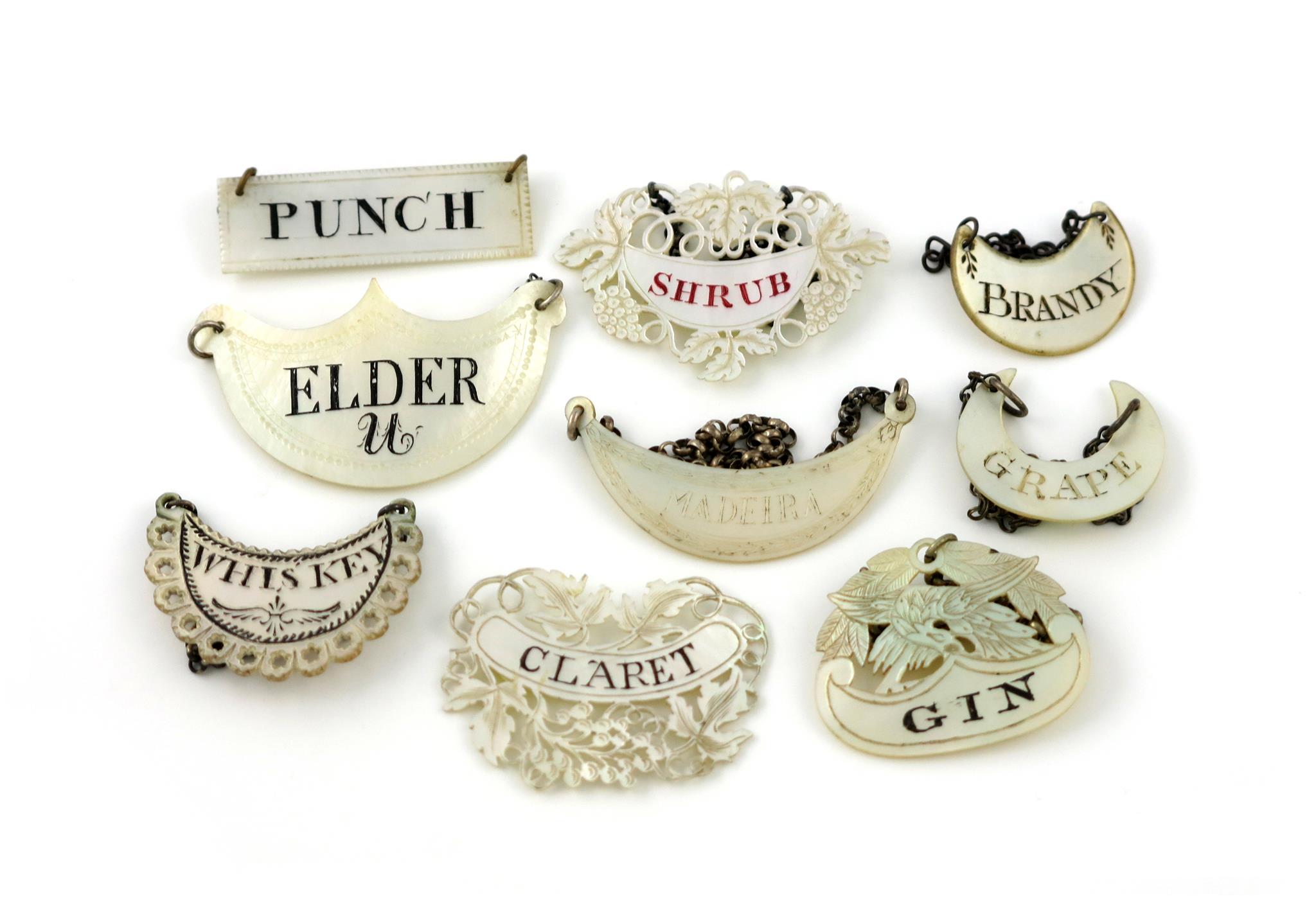 various designs, with pierced and engraved decoration, incised and blackened 'SHRUB', 'CLARET', 'PUNCH', 'GIN', 'ELDER', 'GRAPE', 'BRANDY', 'MADEIRA', and 'WHISKEY'. (9)