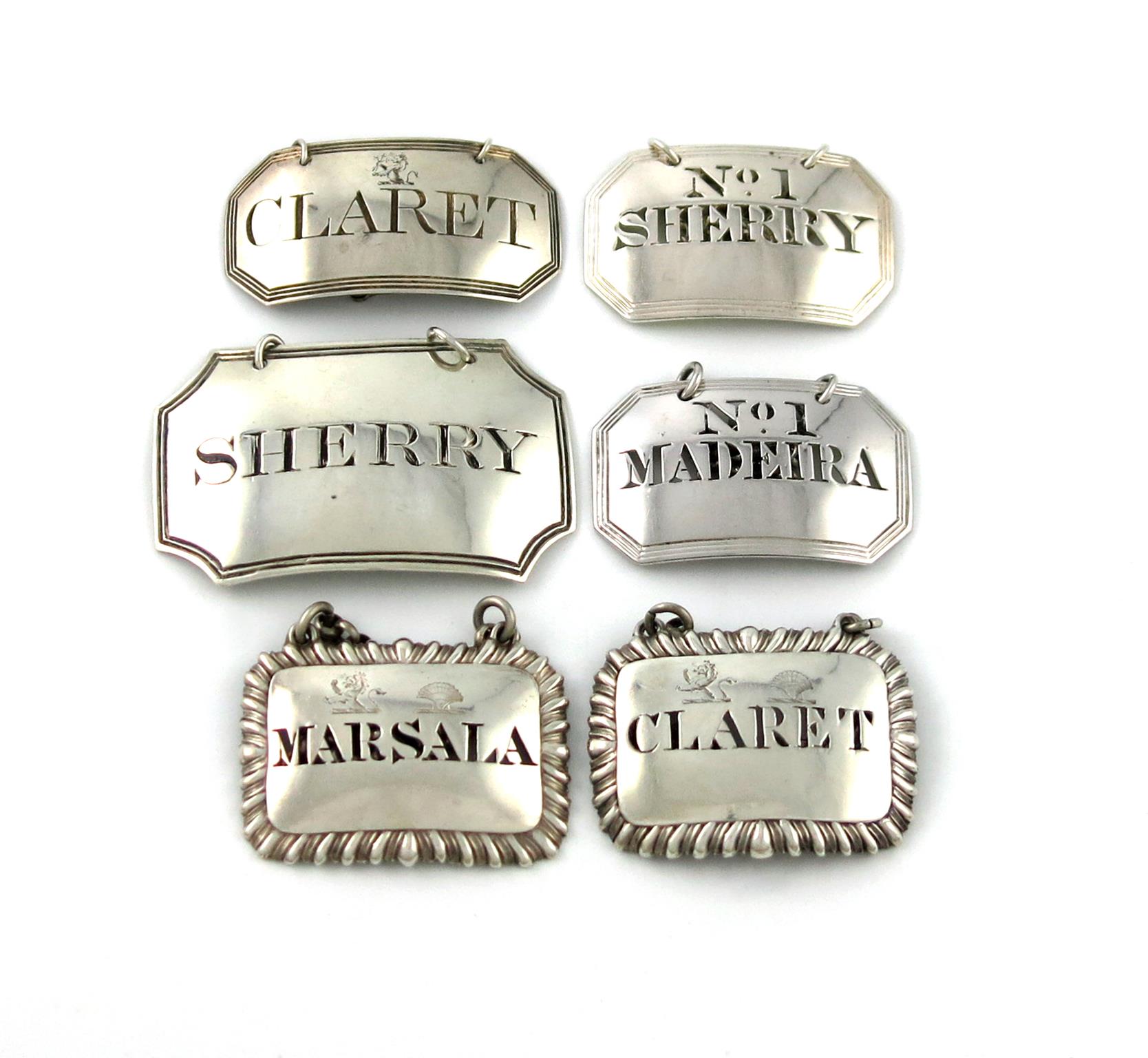 broad rectangular form, reeded and gadroon borders, comprising a large one, London 1820, incised and blackened 'SHERRY', a pair pierced 'No.1 SHERRY' and 'No.1 MADEIRA', plus a pair pierced 'CLARET' and 'MARSALA', and one incised 'CLARET', approx. weight 2.8oz. (6)