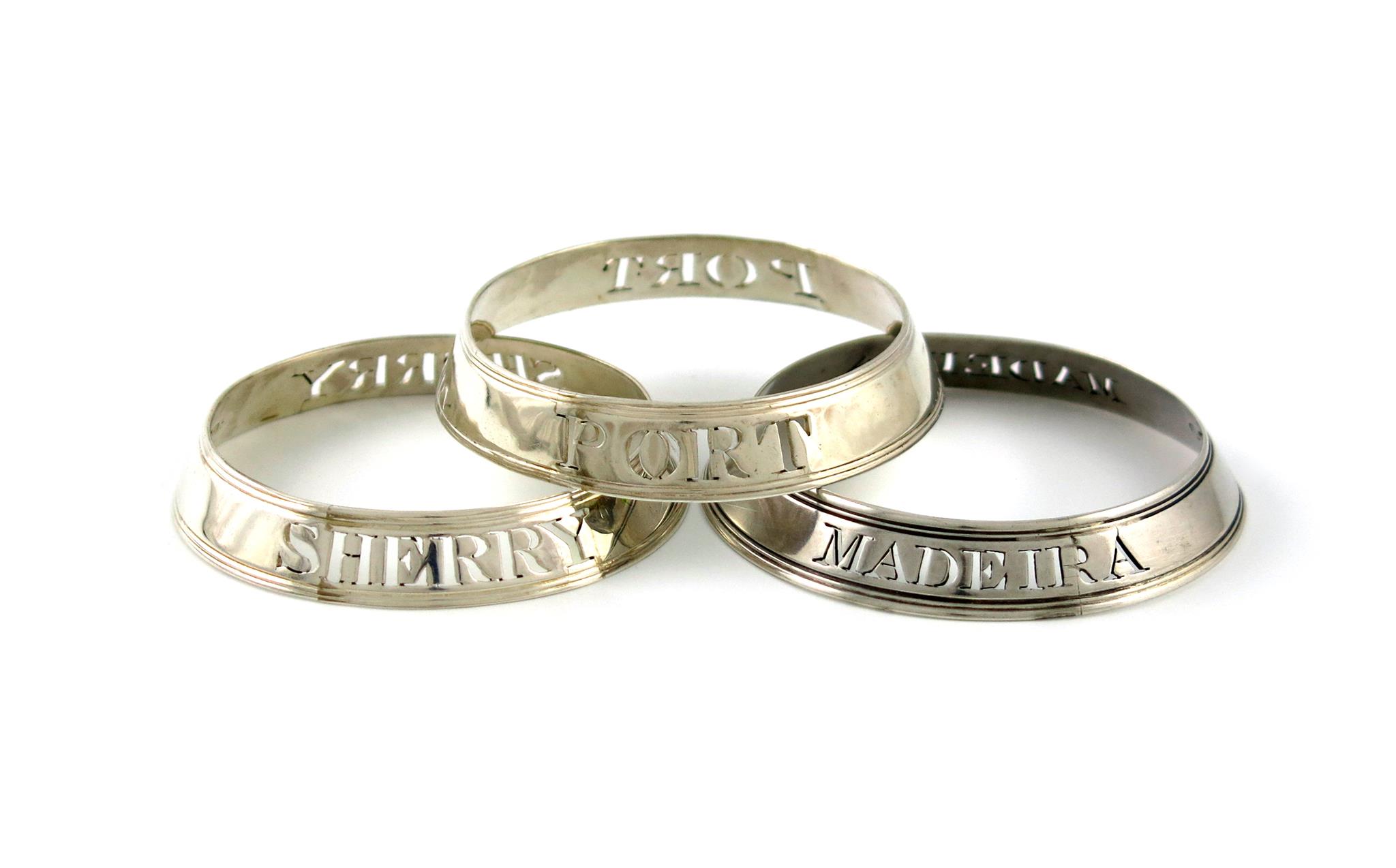 A matched set of three George III silver neck-ring wine labels
