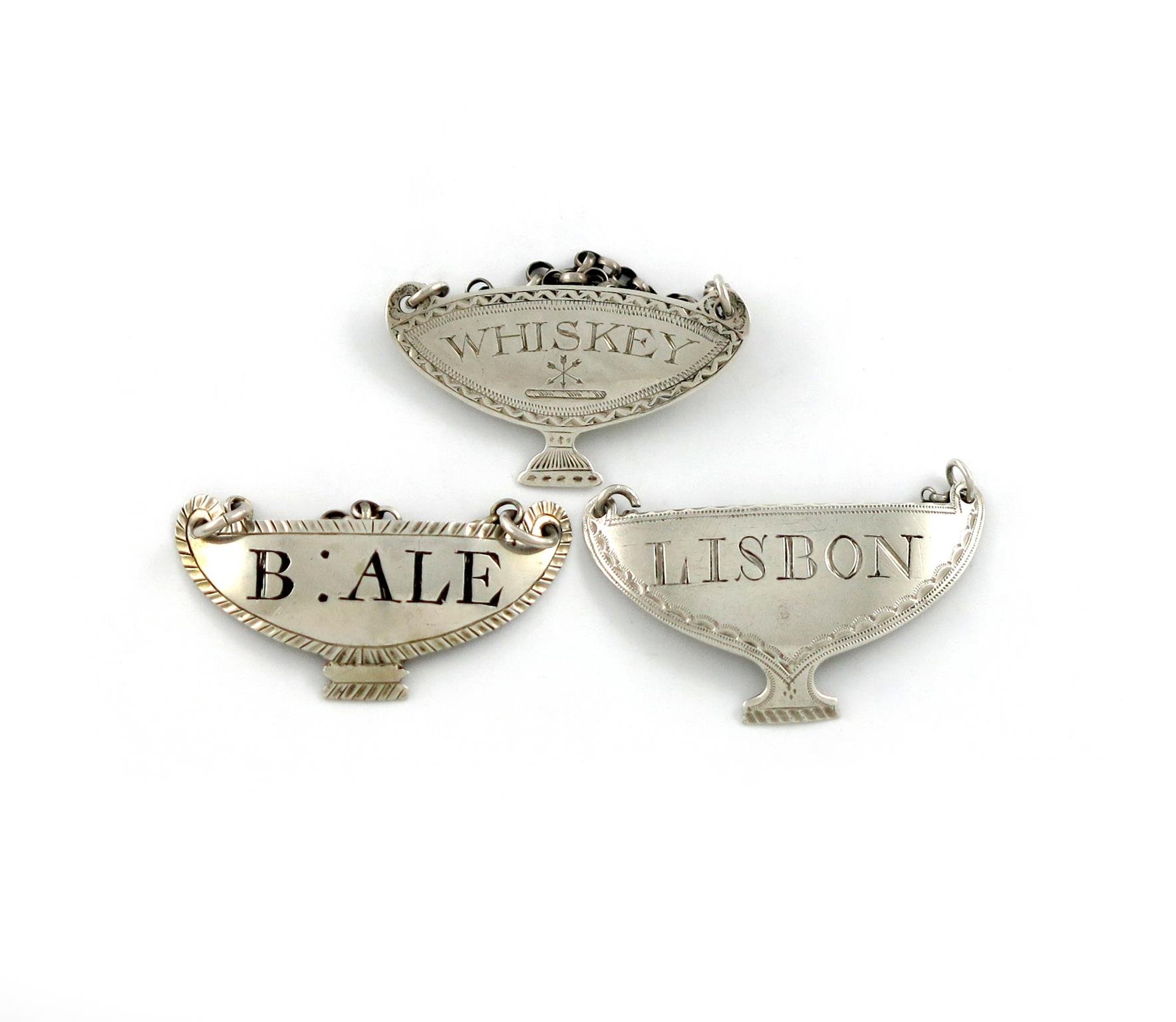 goblet form, bright-cut border, incised 'LISBON', plus another, by Samuel Pemberton, Birmingham 1805, bright-cut border, incised 'WHISKEY' above a crest, and an unmarked label, incised and blackened 'B: ALE', approx. weight 0.5oz. (3)