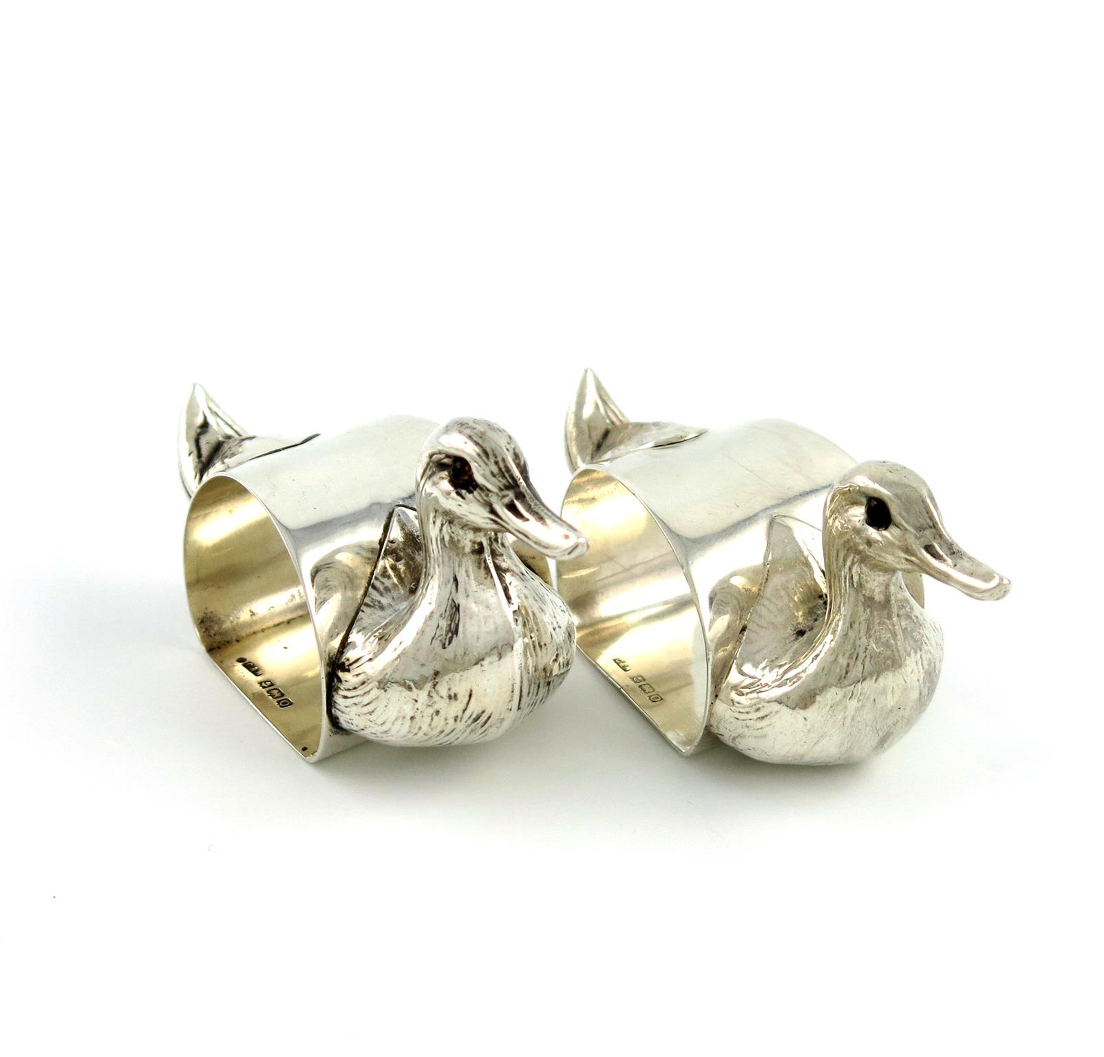 modelled as ducks, the heads set with glass eyes, length 8.5cm, approx. weight 2.3oz. (2)