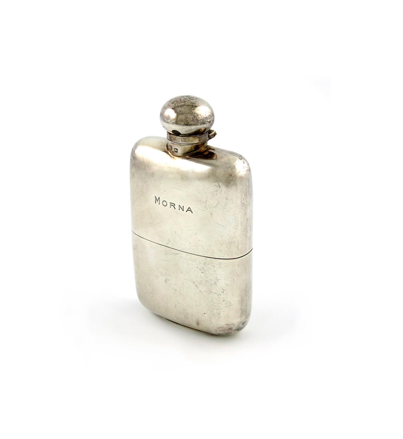 rounded rectangular form, pull-off drinking cup, bayonet fitting hinged cover, length 14cm, inscribed 'MORNA', approx. weight 7.3oz.
