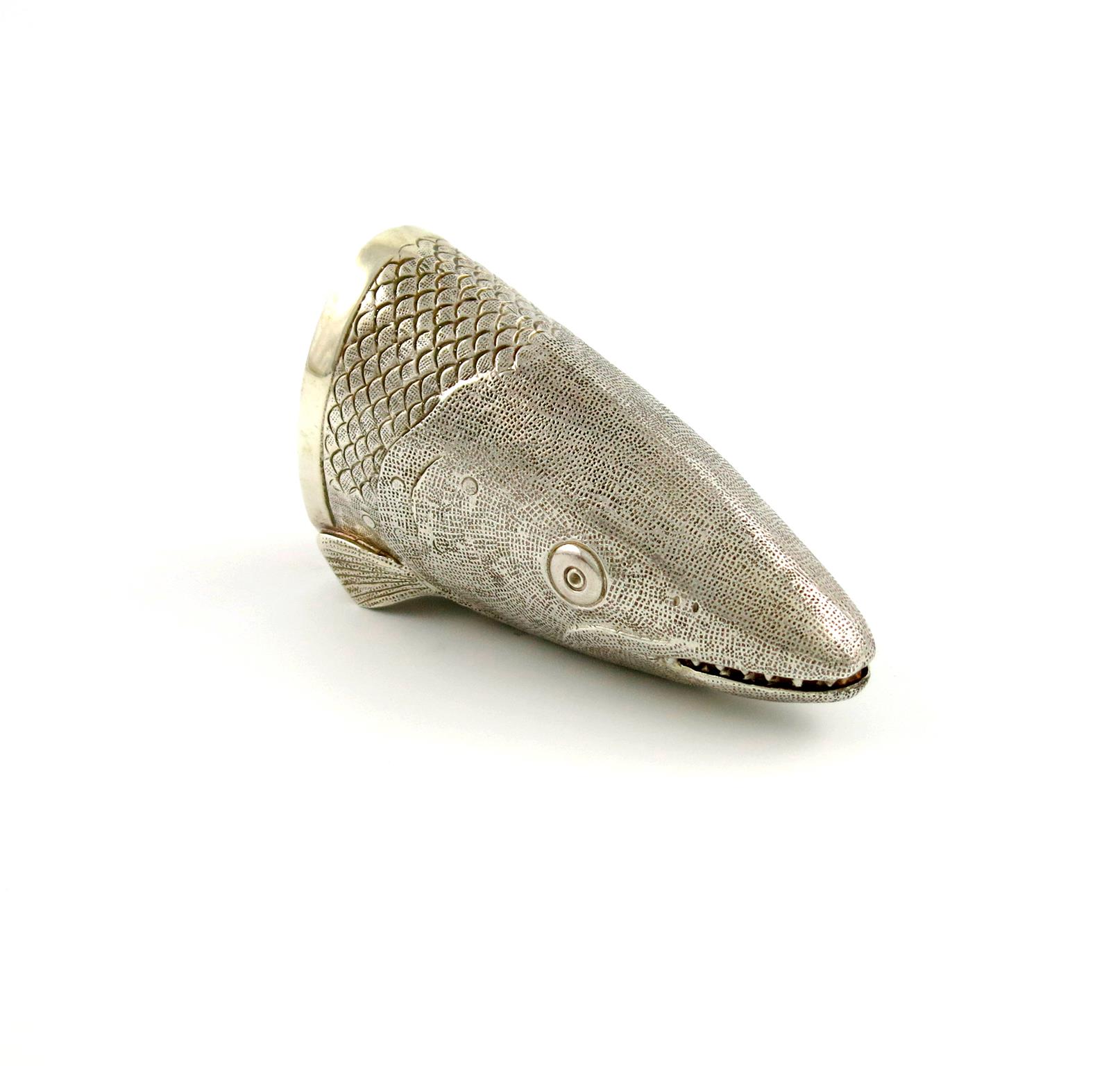 modelled as a salmon head, gilded interior, in a fitted box, height 11cm, approx. weight 8.3oz.