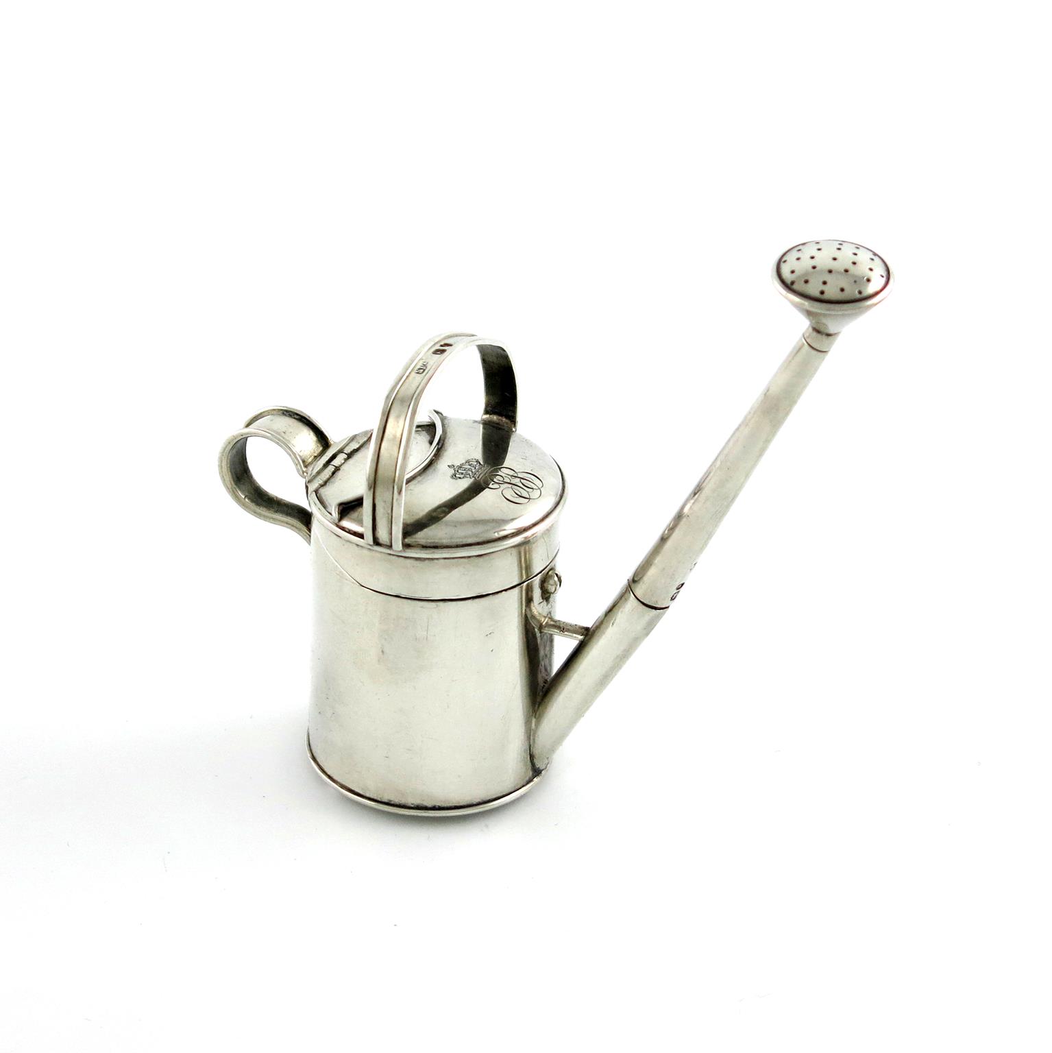 modelled as a watering can, scroll side handle and central carrying handle, the pull out telescopic spout forms the pen, the hinged cover with a recess possibly for stamps, with a crowned initial, the interior with a glass liner, height 10.5cm.