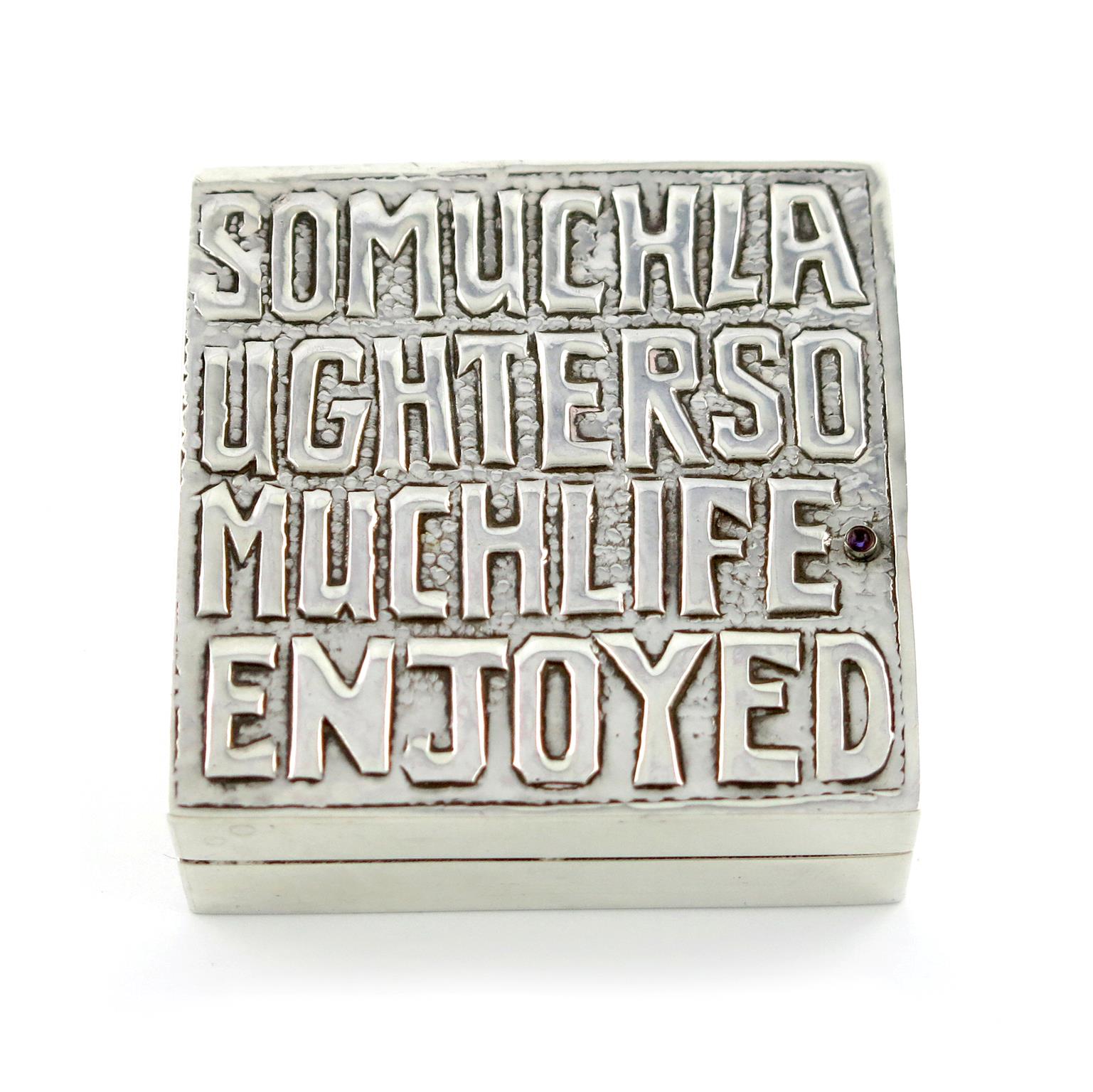square form, the cover chased 'SO MUCH LAUGHTER SO MUCH LIFE ENJOYED', and with a purple stone, the interior gilded, length 7.5cm, approx. weight 7.3oz.