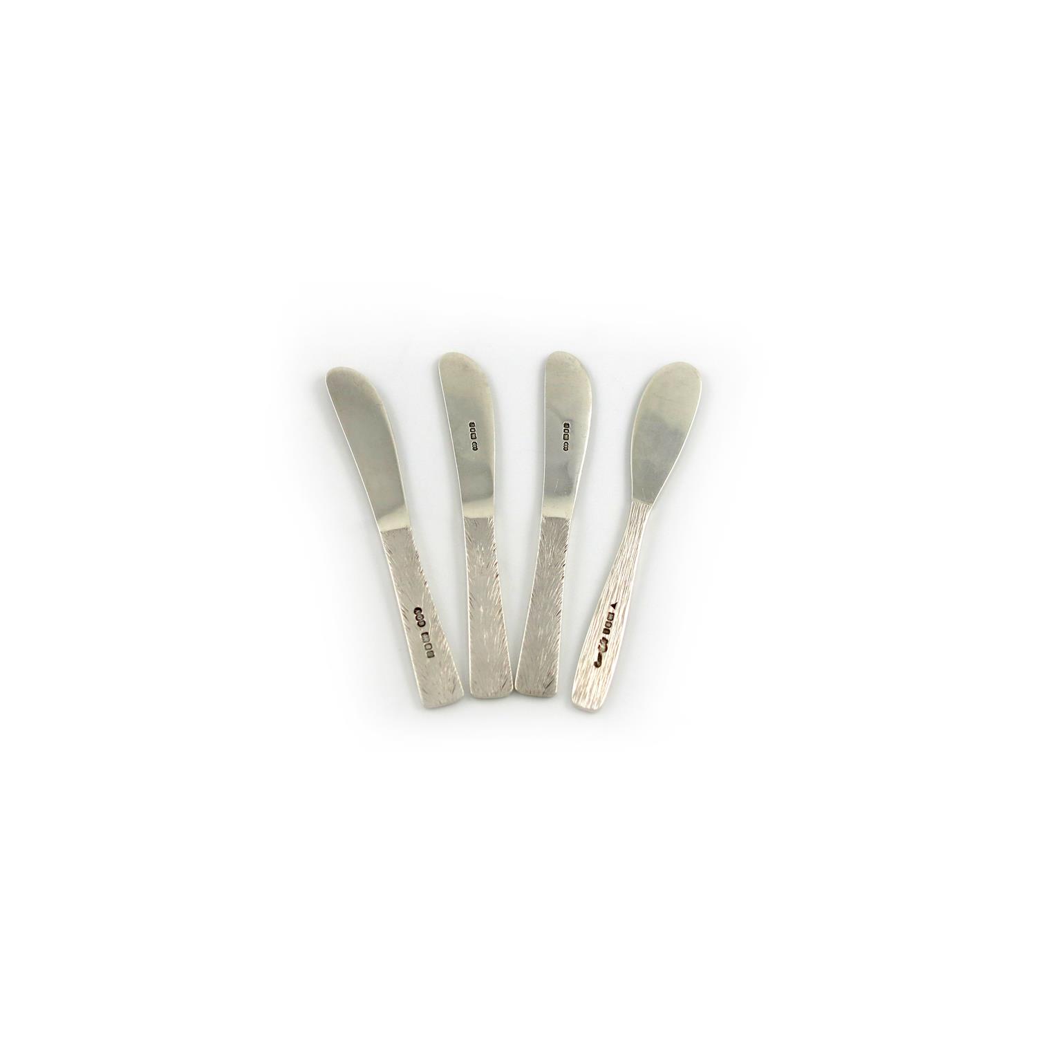 the handles with textured decoration, length 12.3cm, plus a single Benney butter knife, London 1996 and a butter knife by Brian Fuller, London 1985, approx. weight 4oz. (4)