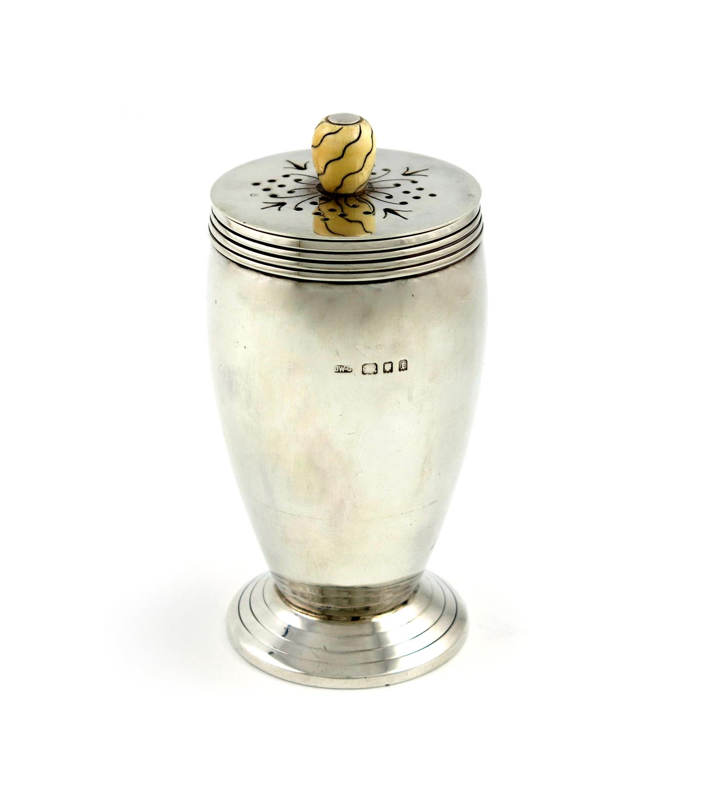 tapering circular form, reeded bands, the pierced cover with a carved ivory finial, on a raised tapering circular foot, height 14cm, approx. weight 6.9oz.