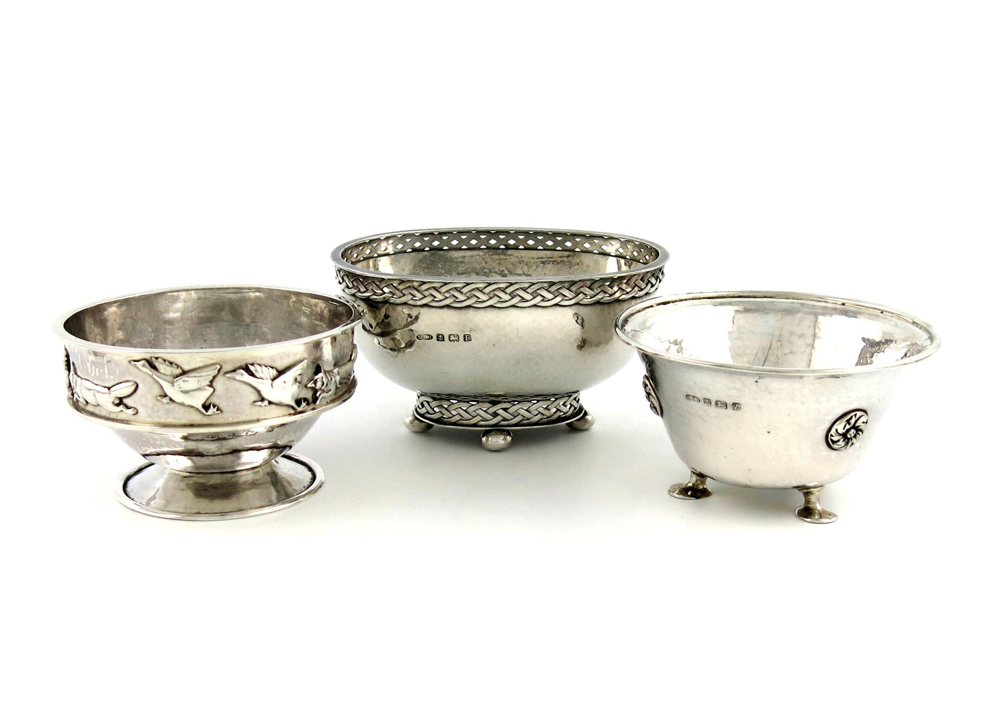 comprising: one of oval form, Birmingham 1930, spot-hammered decoration, interwoven plaited border and foot, on four ball feet, length 13cm, plus a circular bowl, Birmingham 1916, baluster form, spot-hammered decoration, with a border of running foxes chasing geese, on a spreading circular foot, diameter 10.1cm, and a tapering circular bowl, Birmingham 1924, spot-hammered decoration and applied with three floral motifs, on three pad feet, diameter 11.1cm, approx. weight 12.8oz. (3)