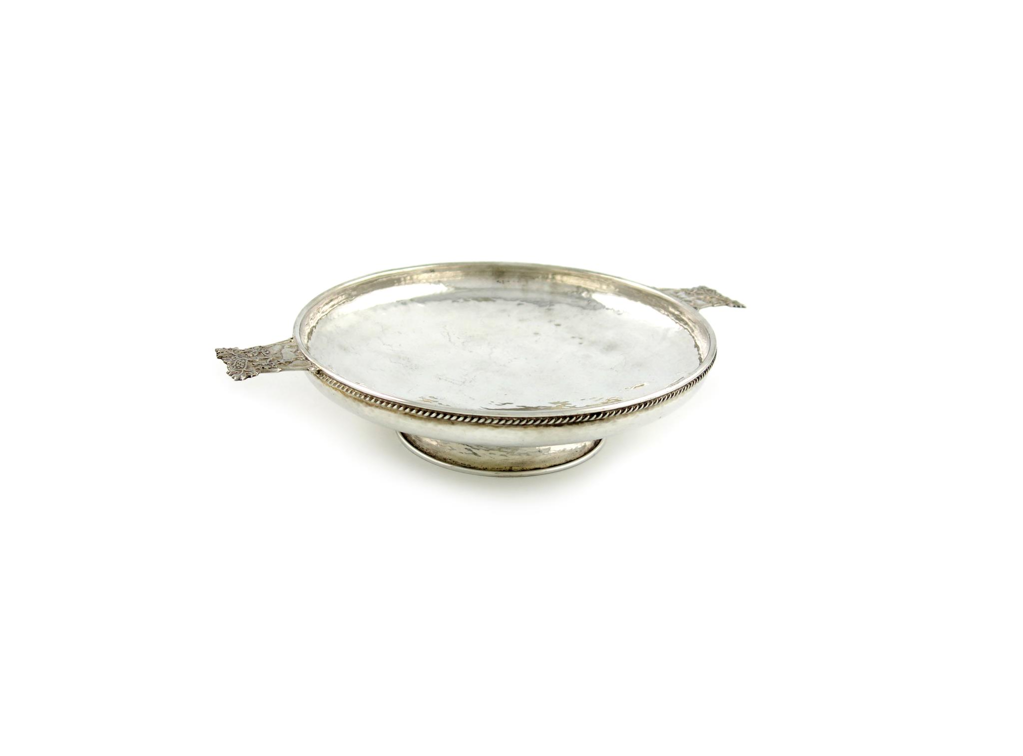 squat circular form, spot-hammered decoration, with a rope-twist border, two cast Tree of Life handles, on a raised tapering circular foot, diameter handle to handle 25cm, approx. weight 6.7oz.