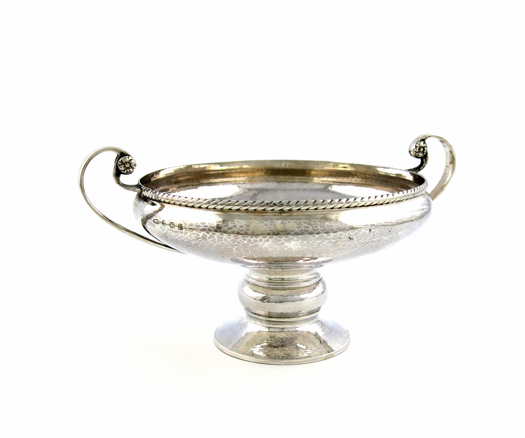 circular bellied form, spot-hammered decoration with a rope-twist border, on a baluster stem and raised circular foot, scroll handles, diameter 7.5cm, approx. weight 11oz.
