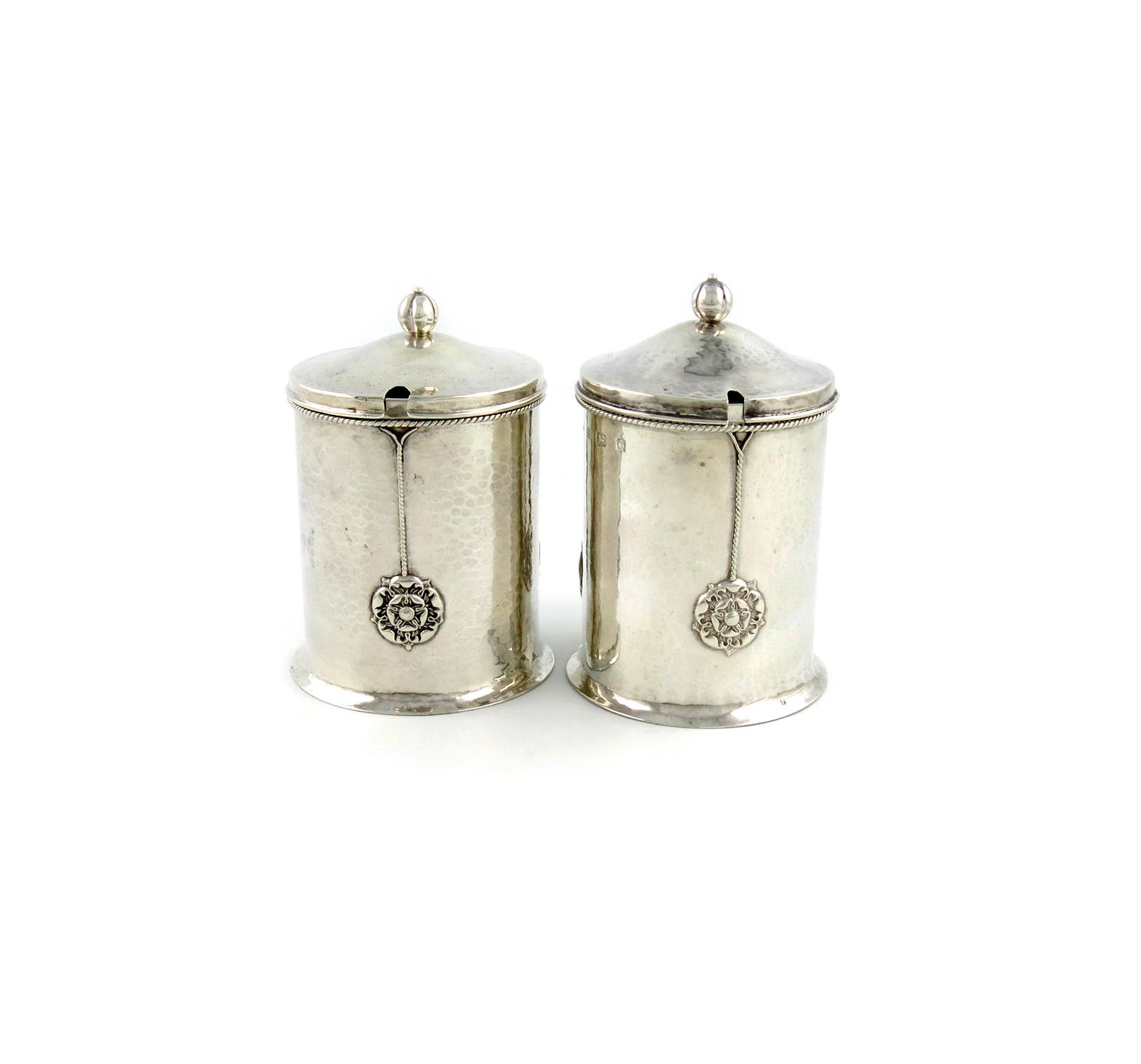 By A. E. Jones, a pair of Arts & Crafts silver jam pots,