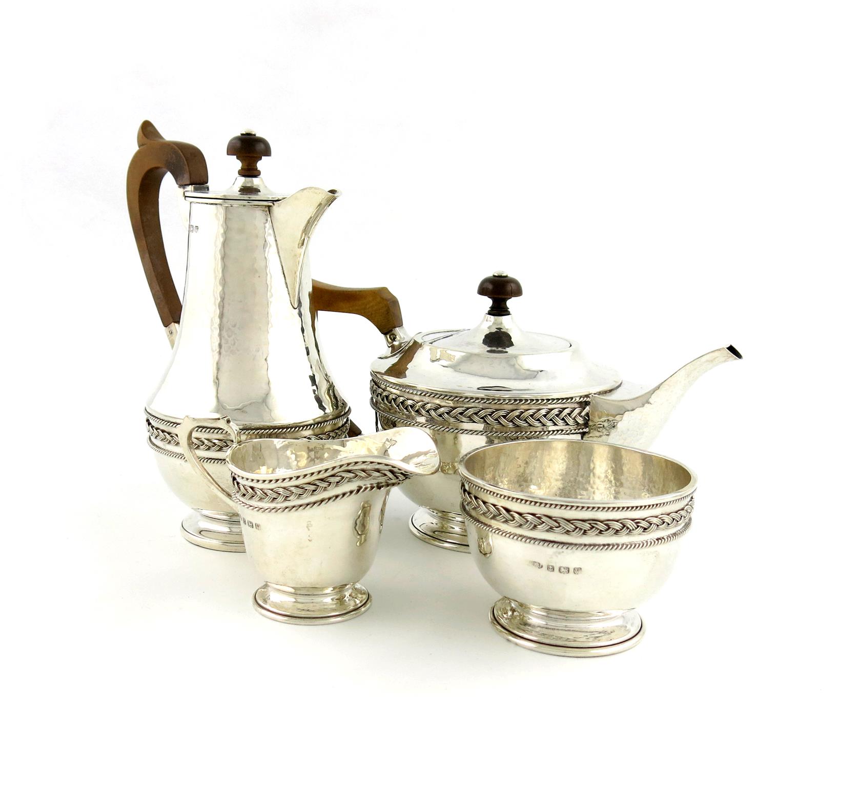 circular form, the tea pot, sugar basin and cream jug with an intertwined plaited and rope-twist border, the hot water pot with a similar girdle, spot-hammered decoration, on a raised circular foot, scroll handles, height of hot water pot 21.2cm, approx. weight 39.6cm. (4)