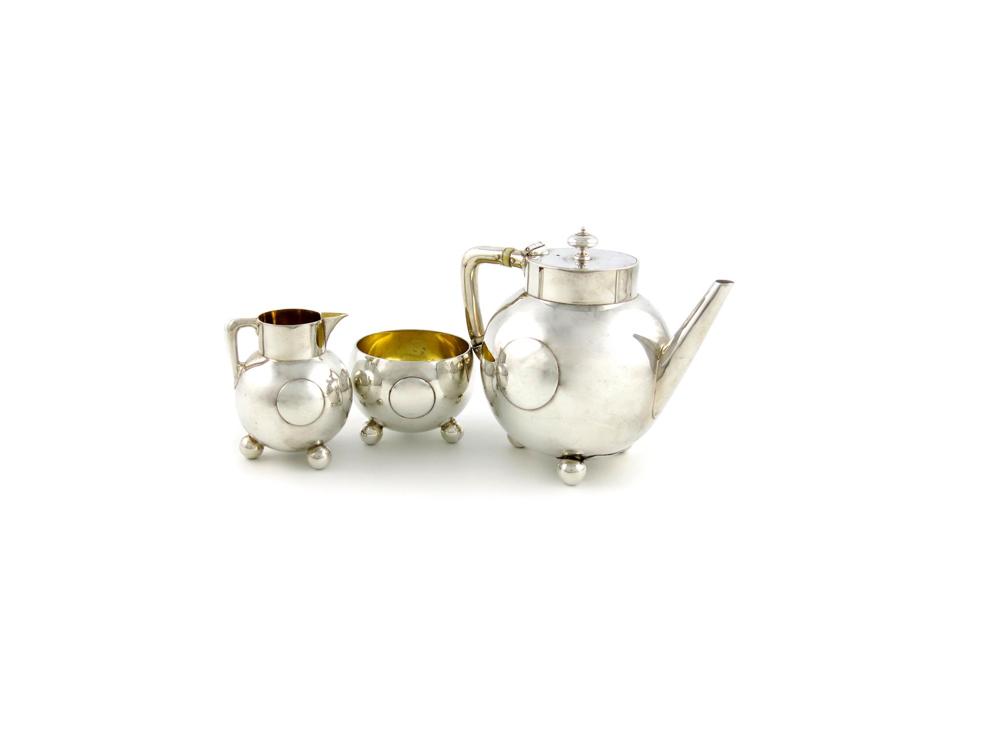 plain circular form, on three ball feet, scroll handles, height of tea pot 12.4cm, approx. weight 13.6oz. (3)