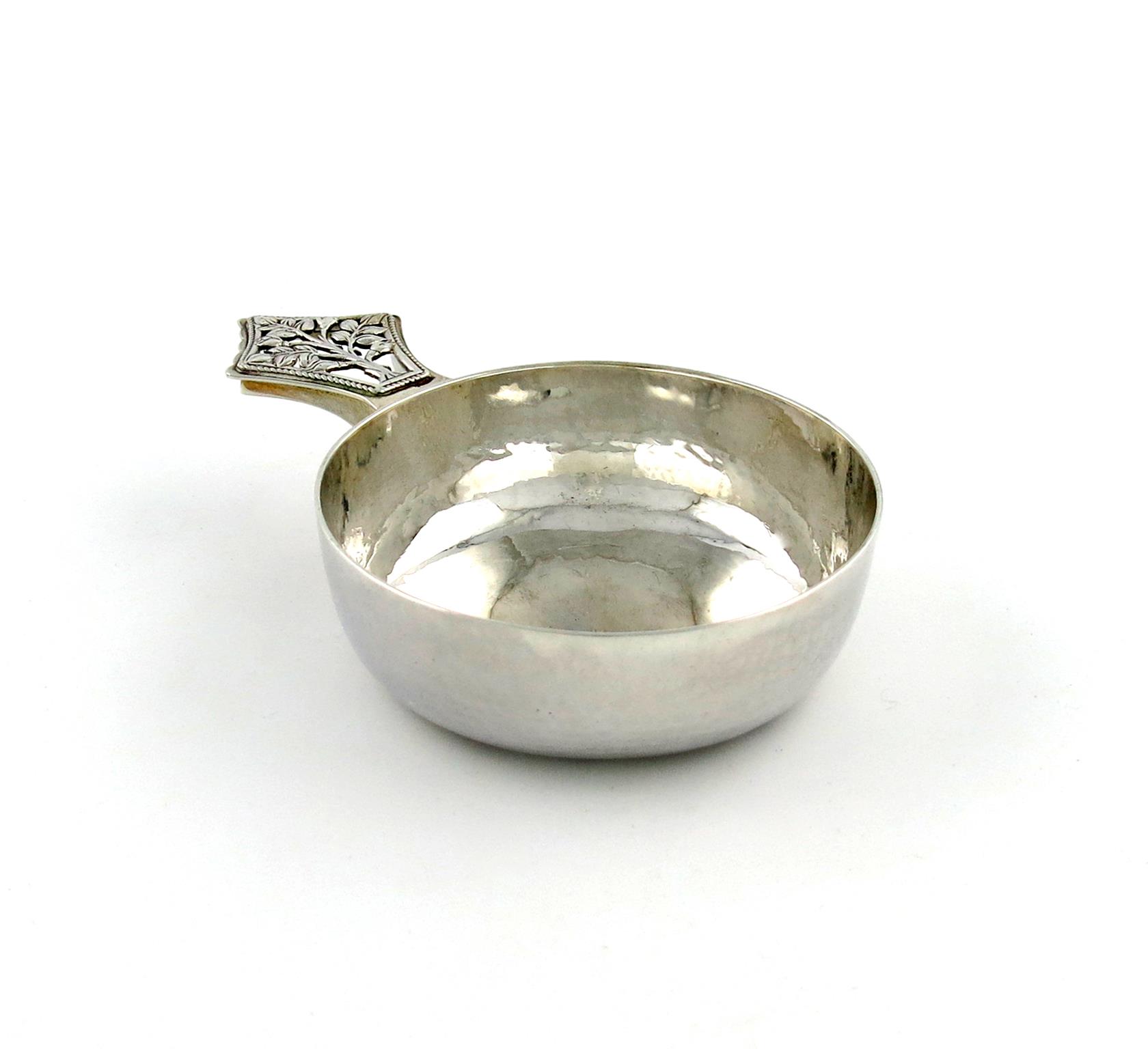 circular bowl with spot-hammered decoration and pierced Tree of Life handle, diameter 8cm, approx. weight 3.3oz.