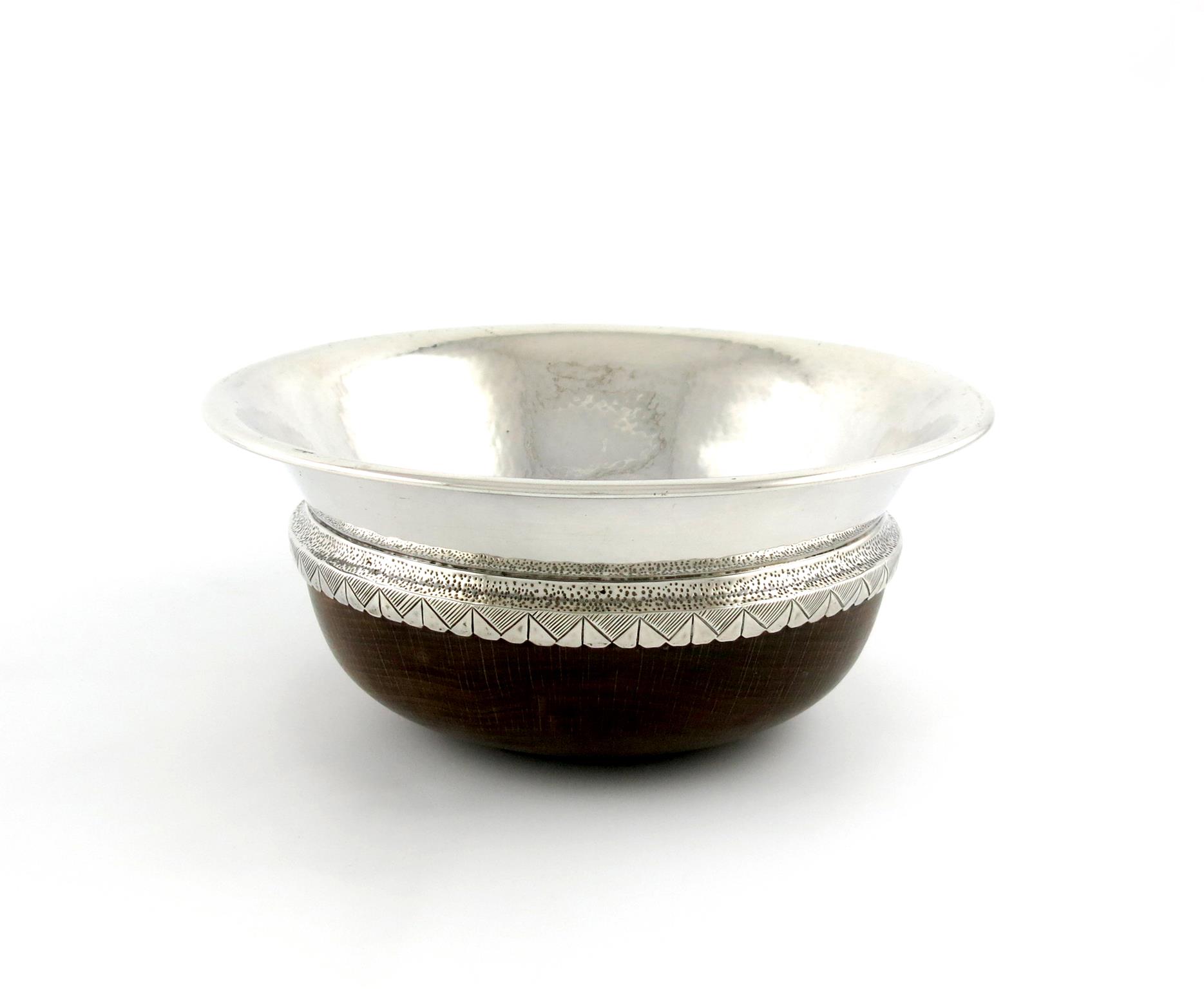circular form, spot-hammered decoration, engraved border, later wooden bowl, diameter 22.5cm,