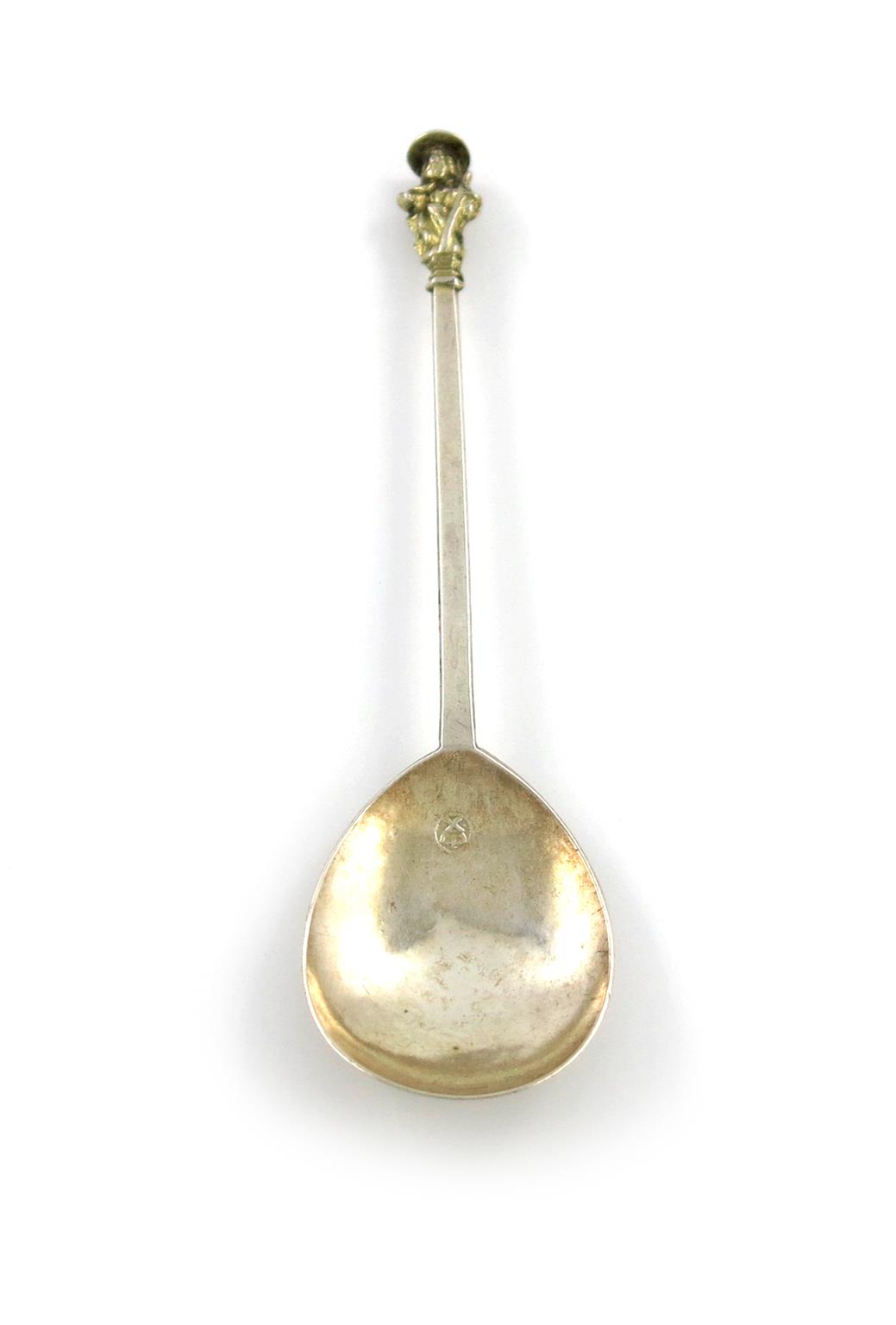 fig-shaped bowl, slightly tapering faceted stem, gilded apostle finial, the nimbus with a dove, the reverse of the bowl with prick-dot initials 'S.F' over 'B.S', '1657', length 19.5cm, approx. weight 1.4oz.