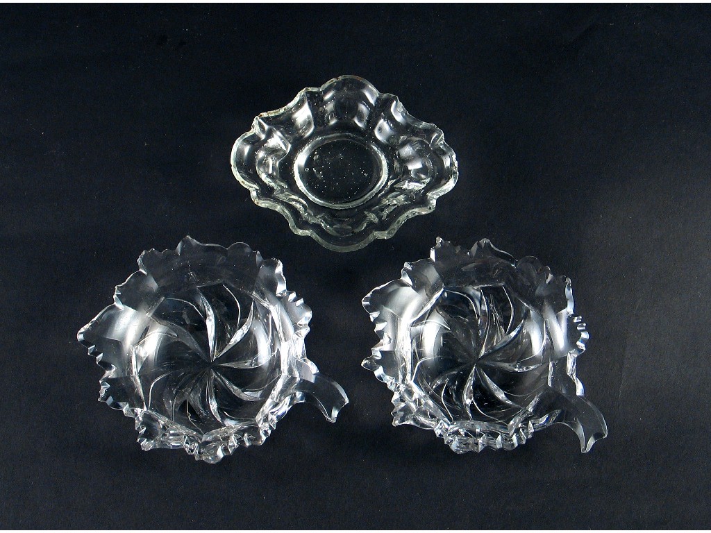 A pair of cut glass leaf-shaped dishes, and a small moulded dish, 18th/19th century, 10.5cm. (3)