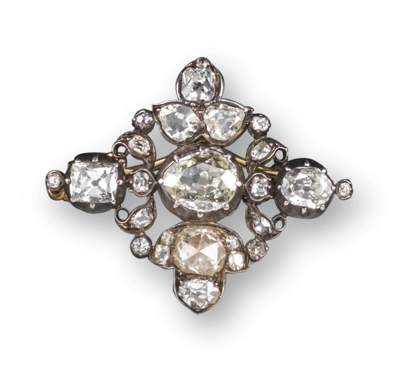 A quatrefoil early 19th century diamond brooch pendant, set with a central old pear-shaped diamond which weighs approximately 1.22cts, within a surround of old cushion-shaped and rose-cut diamonds in silver and gold cut-down collets, detachable brooch fitting, 4cm long