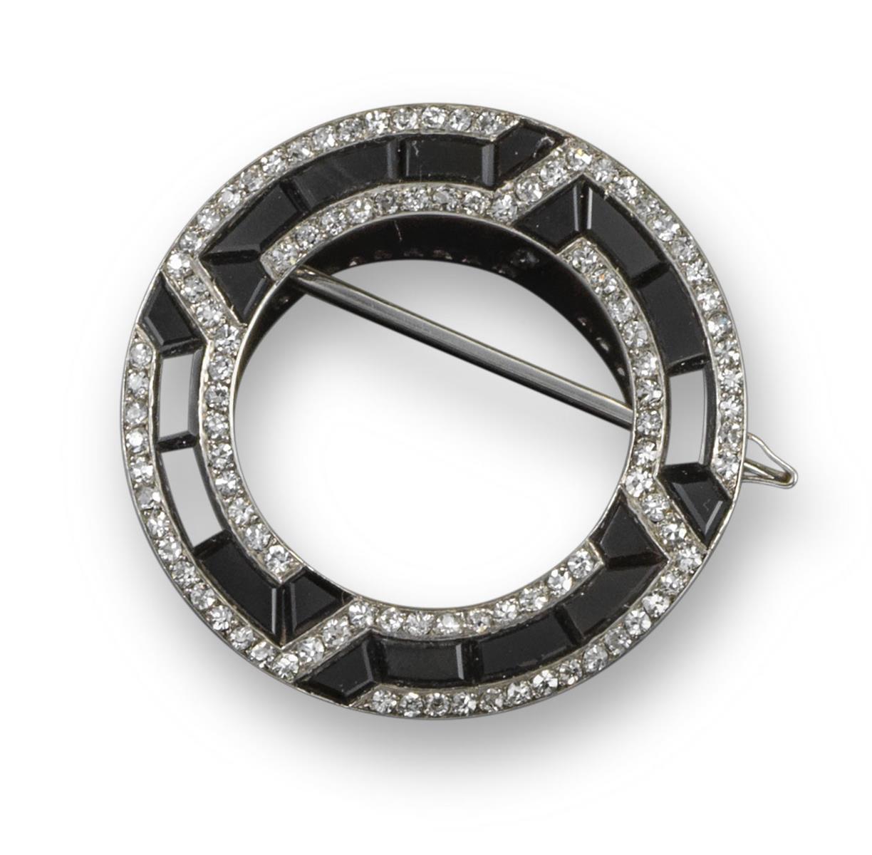 A French Art Deco circular brooch, set with carved sections of black onyx within borders of small circular-cut diamonds in white gold, French control marks, 4cm wide, fitted box by Bolin