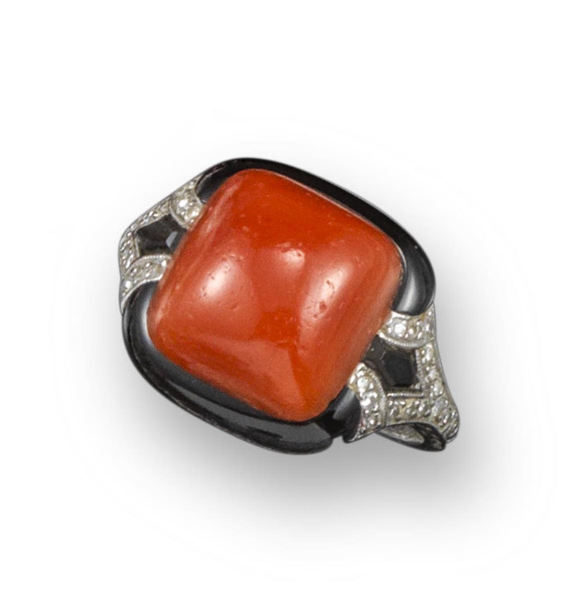 An Art Deco coral, onyx and diamond-set ring, the sugarloaf-shaped coral is set within a surround of black onyx and small diamonds to the bifurcated shoulders in platinum, size M