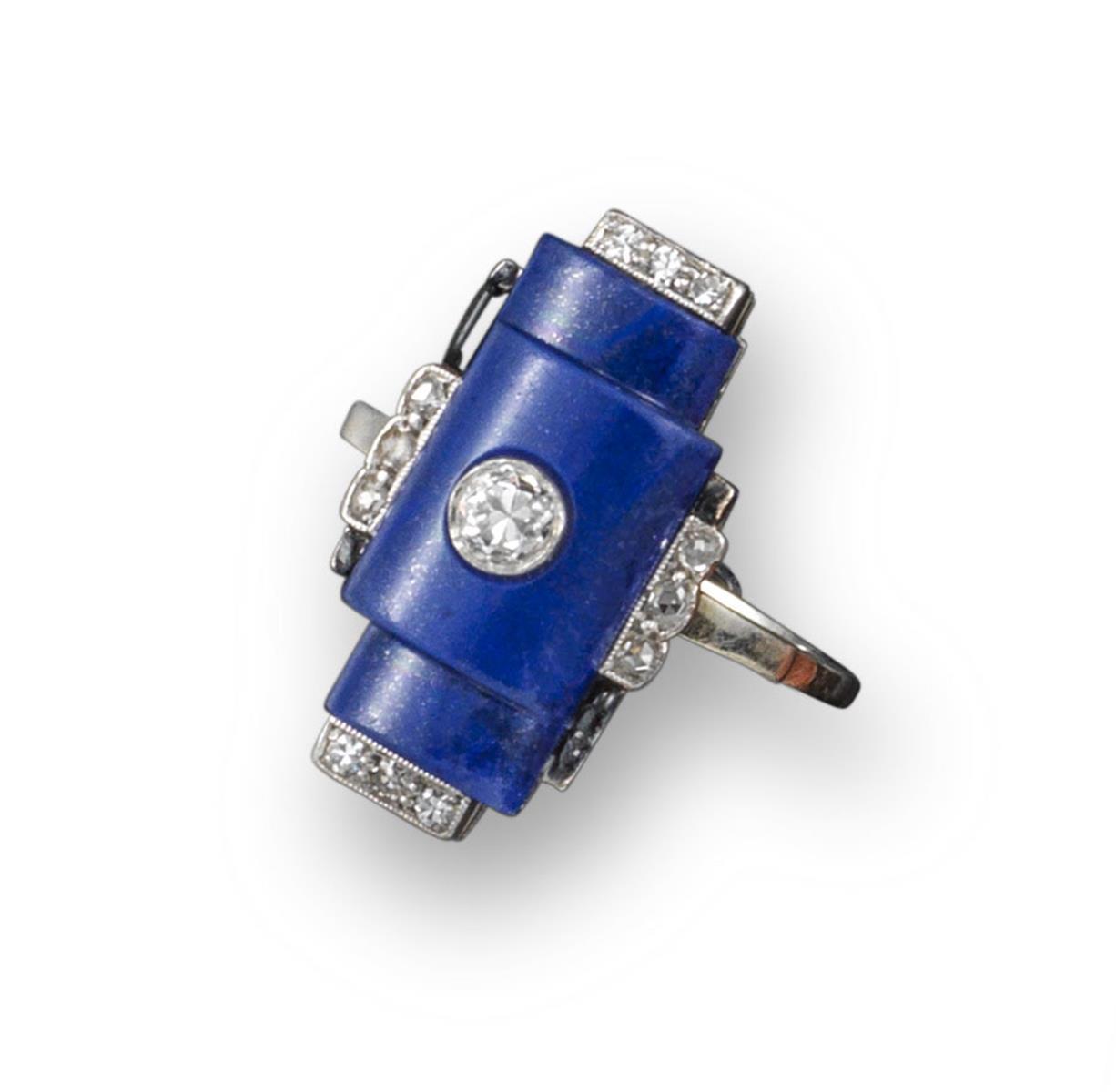 An Art Deco lapis lazuli diamond and enamel ring, of geometric design, set with a central old circular-cut diamond within a carved lapis lazuli semi-spherical section and a border of black enamel and diamonds, set in platinum and white gold, size N ½