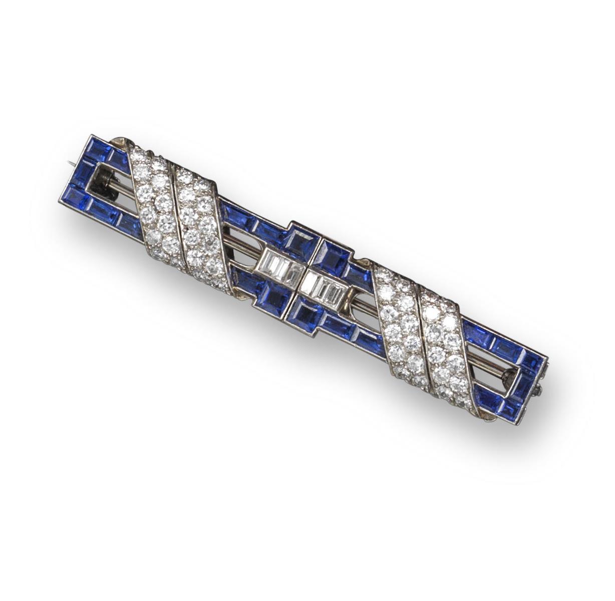 A pair of Art Deco sapphire and diamond double clip brooches, the rectangular clips channel-set with calibré-cut sapphires and decorated with diamond swags and baguette-shaped diamonds in platinum and gold, each clip 2.8cm long