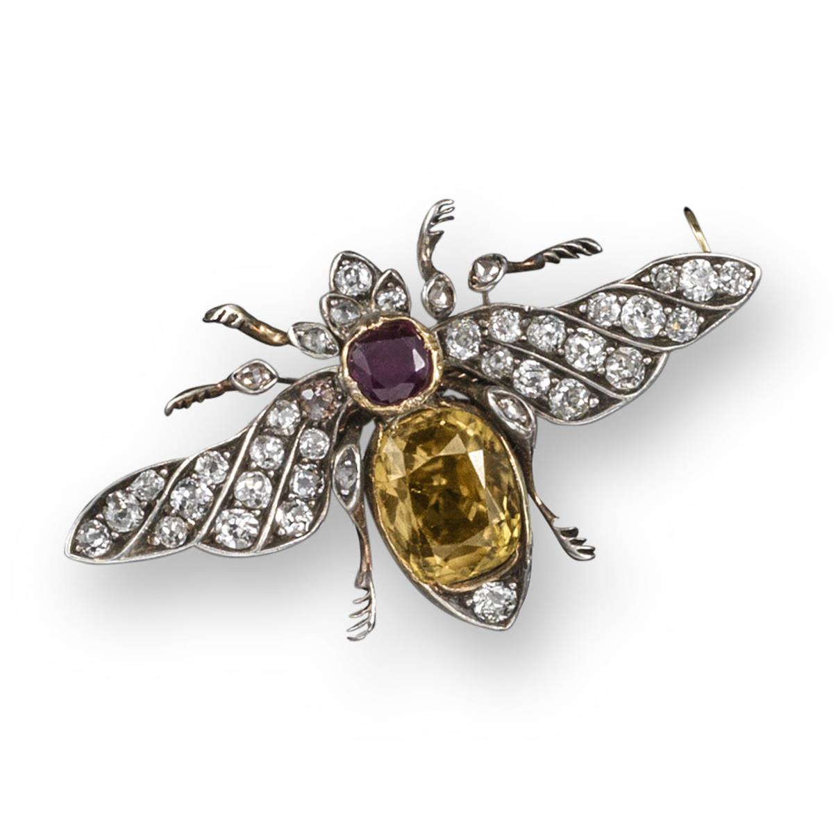 A Victorian zircon and diamond bee brooch, the body formed from a cushion-shaped yellow zircon and a cushion-shaped ruby, with graduated cushion-shaped diamonds to the wings in silver and gold, 4.4cm high