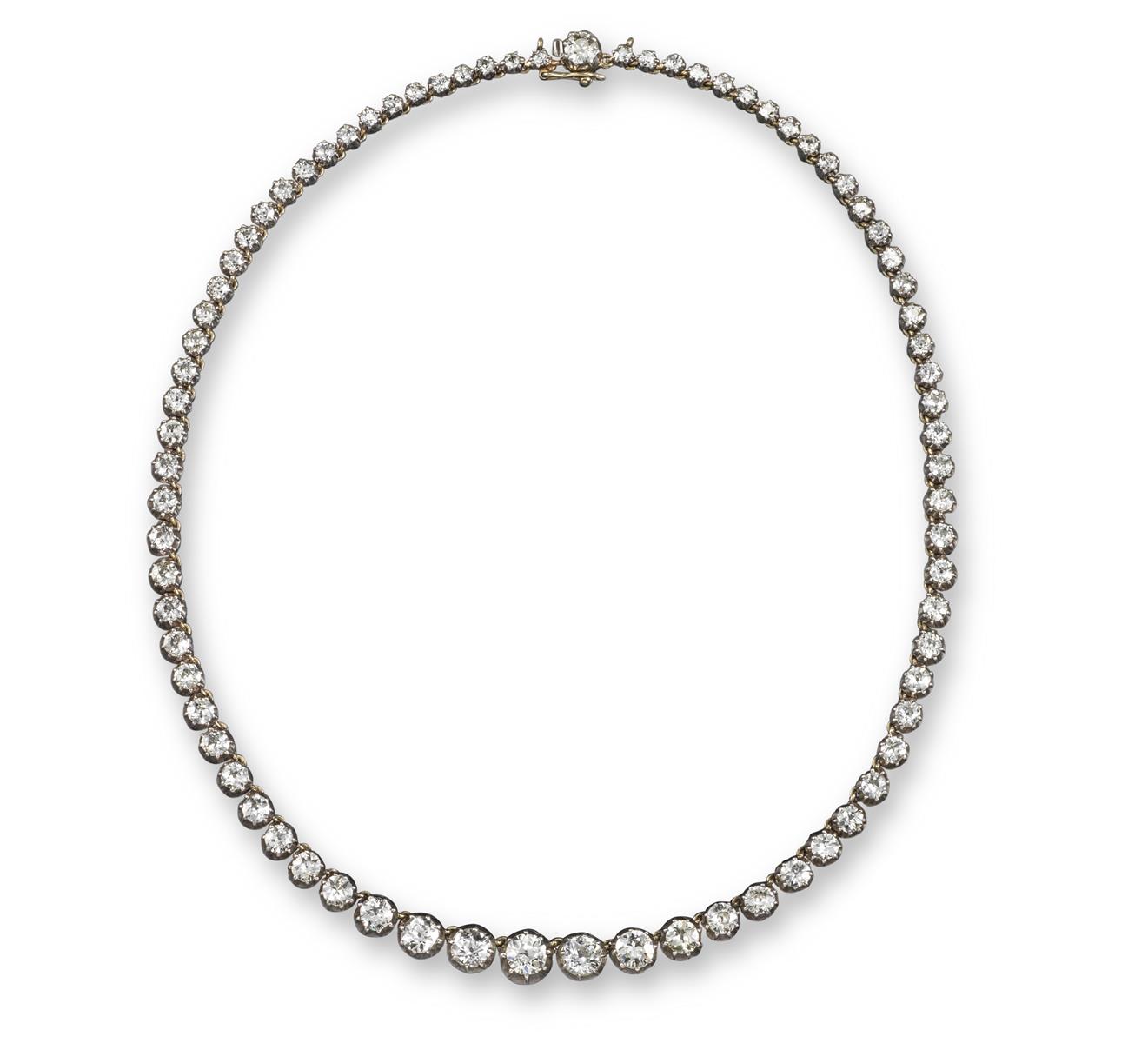 A late Victorian diamond rivière necklace, set with graduated old circular-cut diamonds, the principal stone weighs approximately 0.71cts, set in silver and gold cut down collets, with a folding pendant loop and diamond clasp, 37cm long