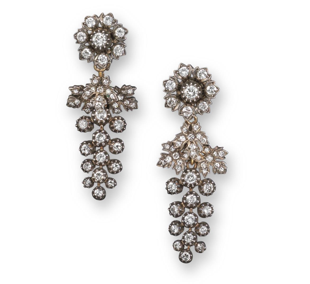A pair of Victorian diamond-set pendant earrings, the upper foliate cluster sections suspend a detachable articulated diamond drop section set overall with old circular-cut diamonds in silver cut-down collets, the lower drops divide into two so the earrings can be worn in three different ways, screw fittings, 5.7cm longest