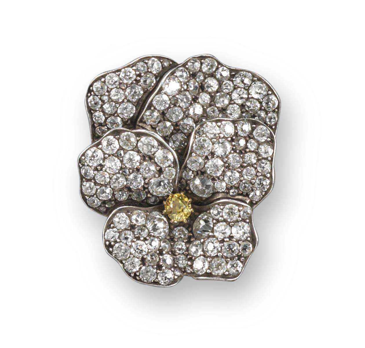 A late 19th century diamond pansy brooch pendant, the stylised flower is pave-set with diamonds and a central yellow diamond in silver and gold, with detachable brooch fitting and folding pendant loop, 4.2cm
