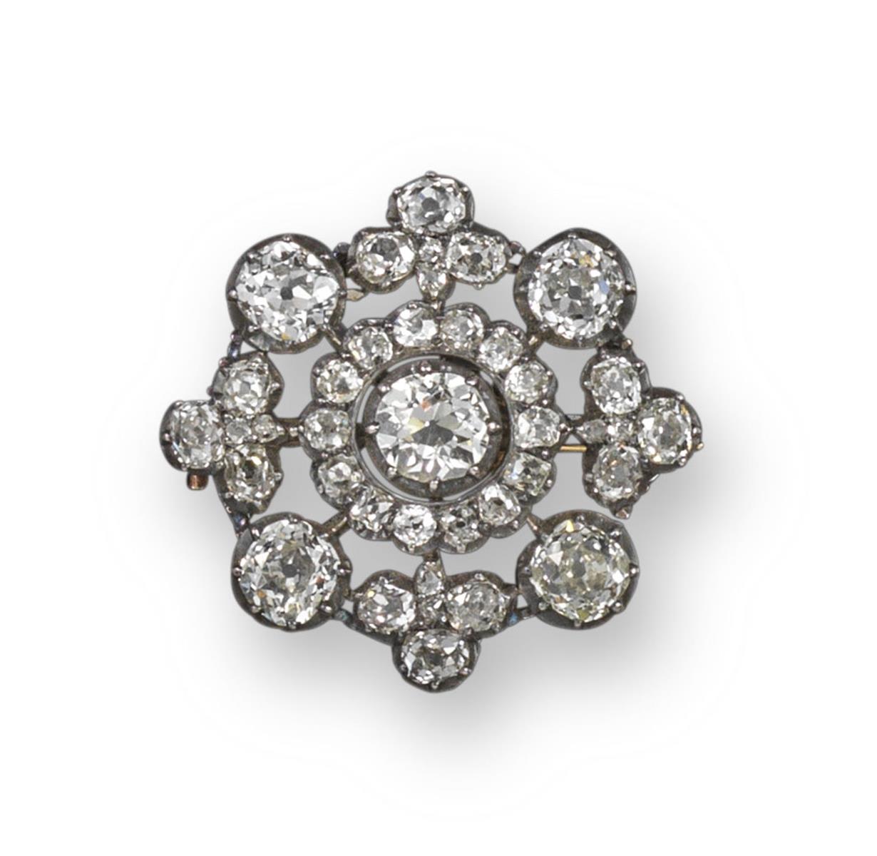 A Victorian diamond-set target brooch, set with a central cluster of old circular-cut diamonds within an outer border of diamond trefoils and single circular-cut diamonds in silver collets on gold, 2.7cm diameter
