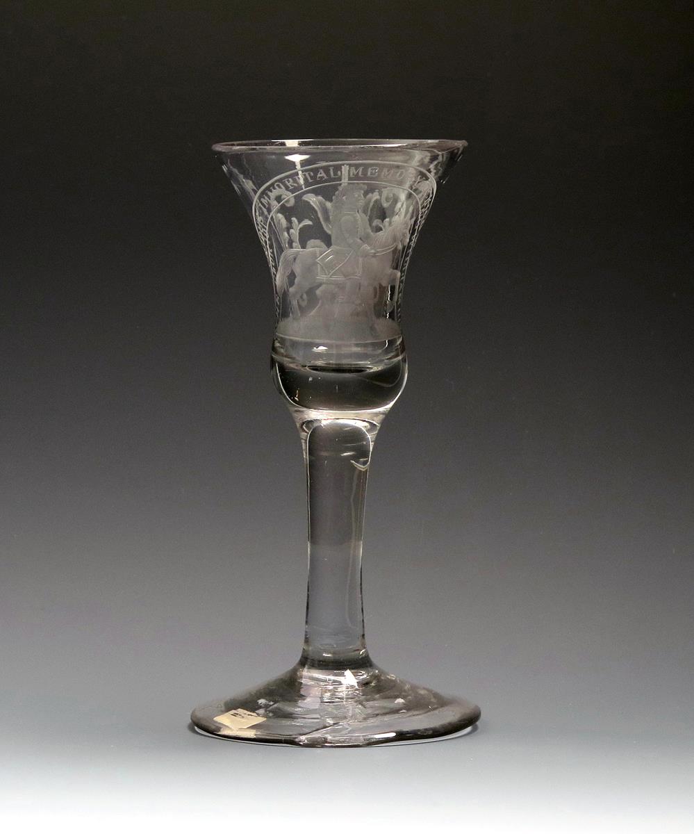 A Williamite wine glass c.1750-60, the bell bowl engraved with the king on horseback beneath a banner proclaming 'The Glorious Immortal Memory of King William III', a formal scroll engraved to the other side, raised on a plain stem above a wide conical foot, 15.7cm.