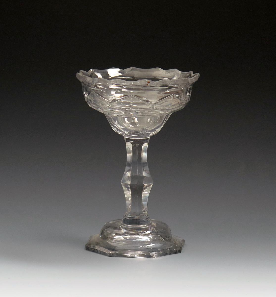 A cut glass sweetmeat c.1760, the slight ogee bowl cut with a continuous design below a shaped rim, raised on a swollen faceted stem above a domed octagonal foot, a few small chips, 15cm.