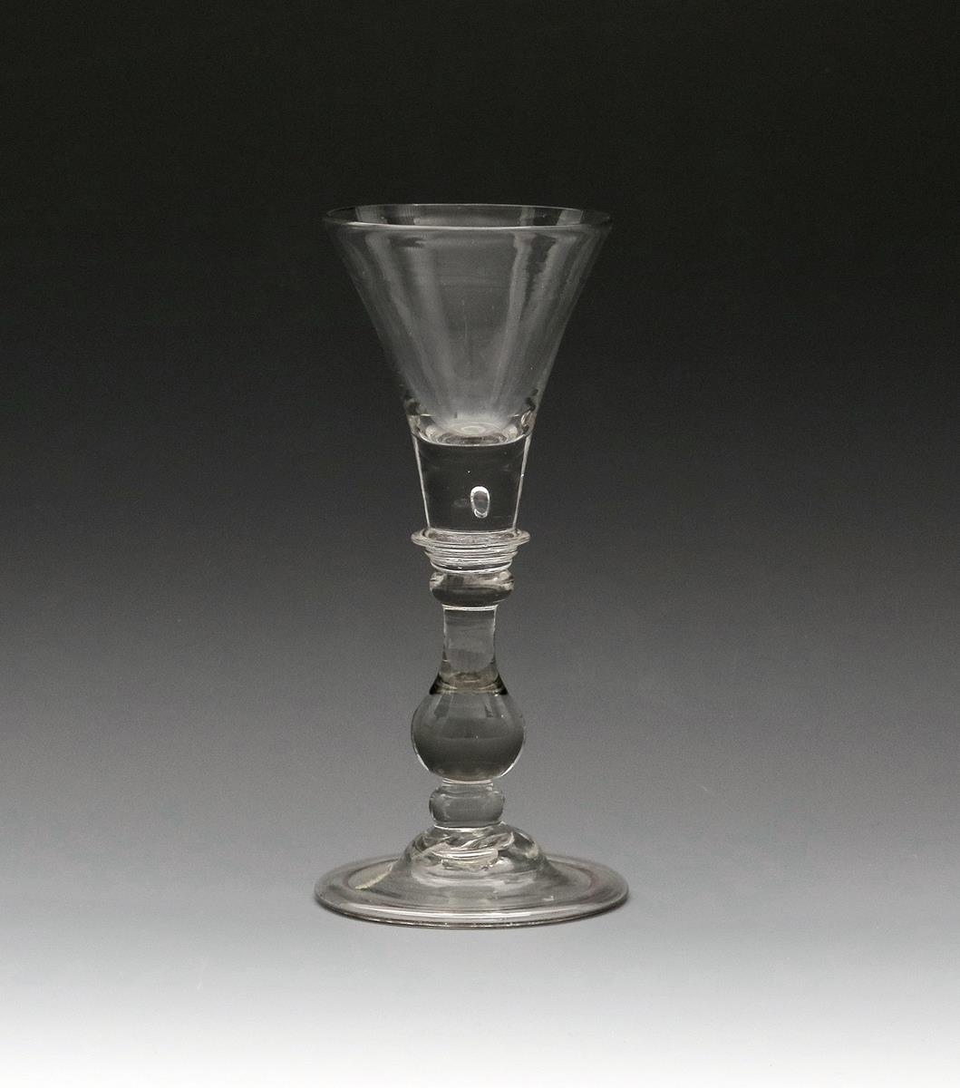 A baluster wine glass c.1720-30, the drawn trumpet bowl enclosing a small tear to the base above a collar and swollen stem over a domed folded foot, 17cm.