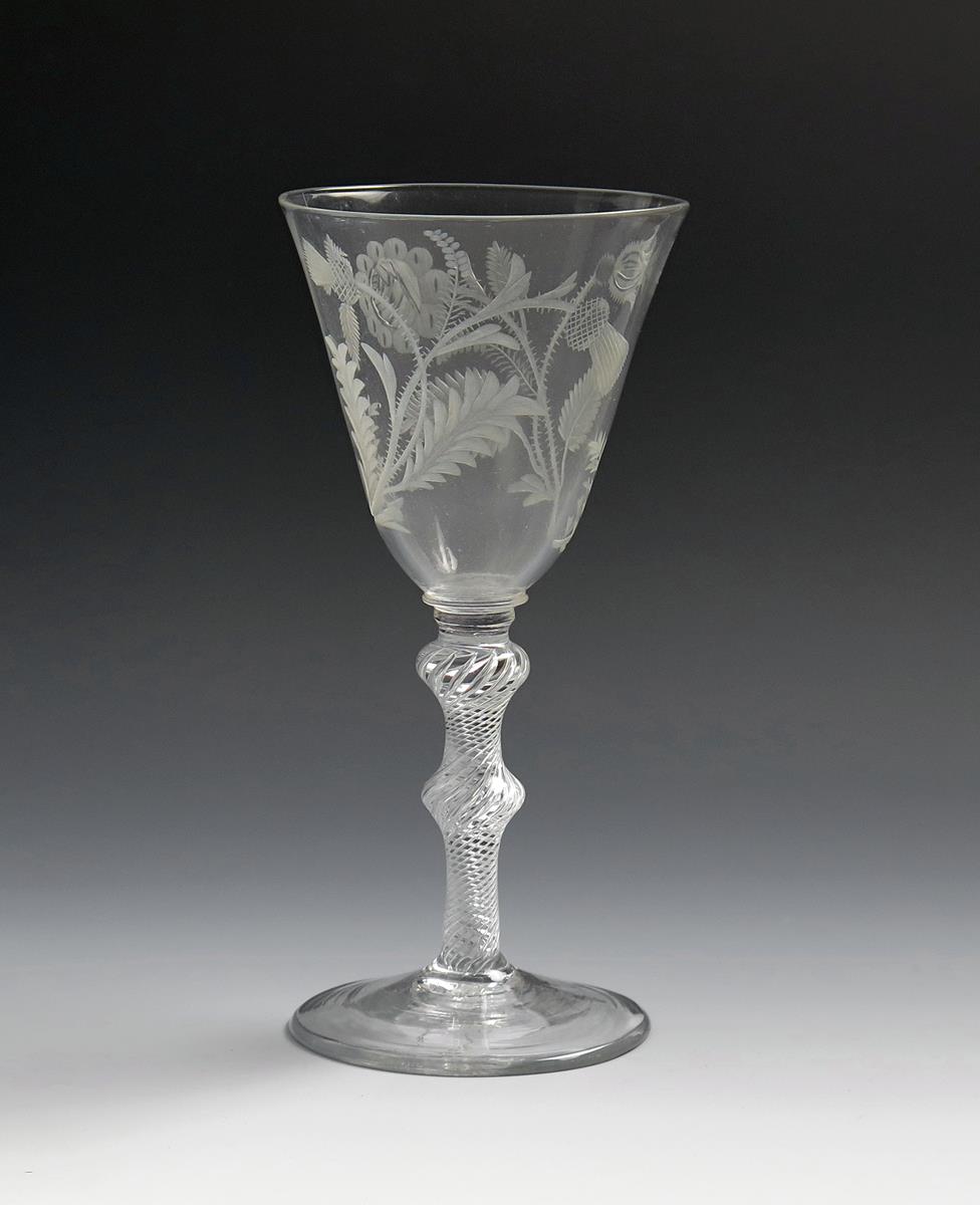 A rare glass of Scottish Jacobite significance c.1760, the large rounded funnel bowl engraved with a thistle and a rose spray, raised on a double-knopped airtwist stem above a conical foot, 18.4cm.