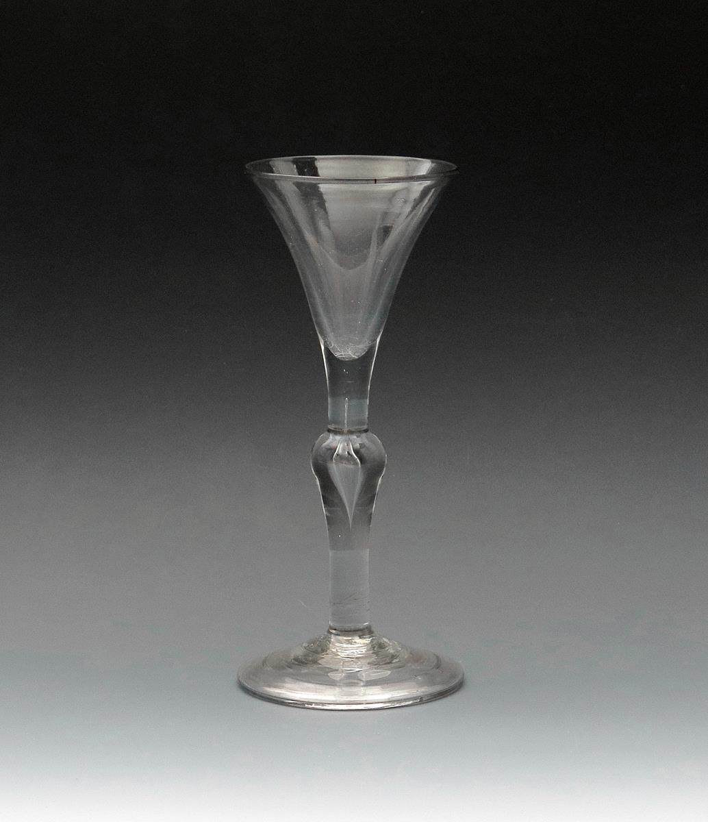 A baluster wine glass c.1720, the drawn trumpet bowl rising from a slender plain stem above an inverted baluster enclosing a long tear, on a folded conical foot, 16.8cm.