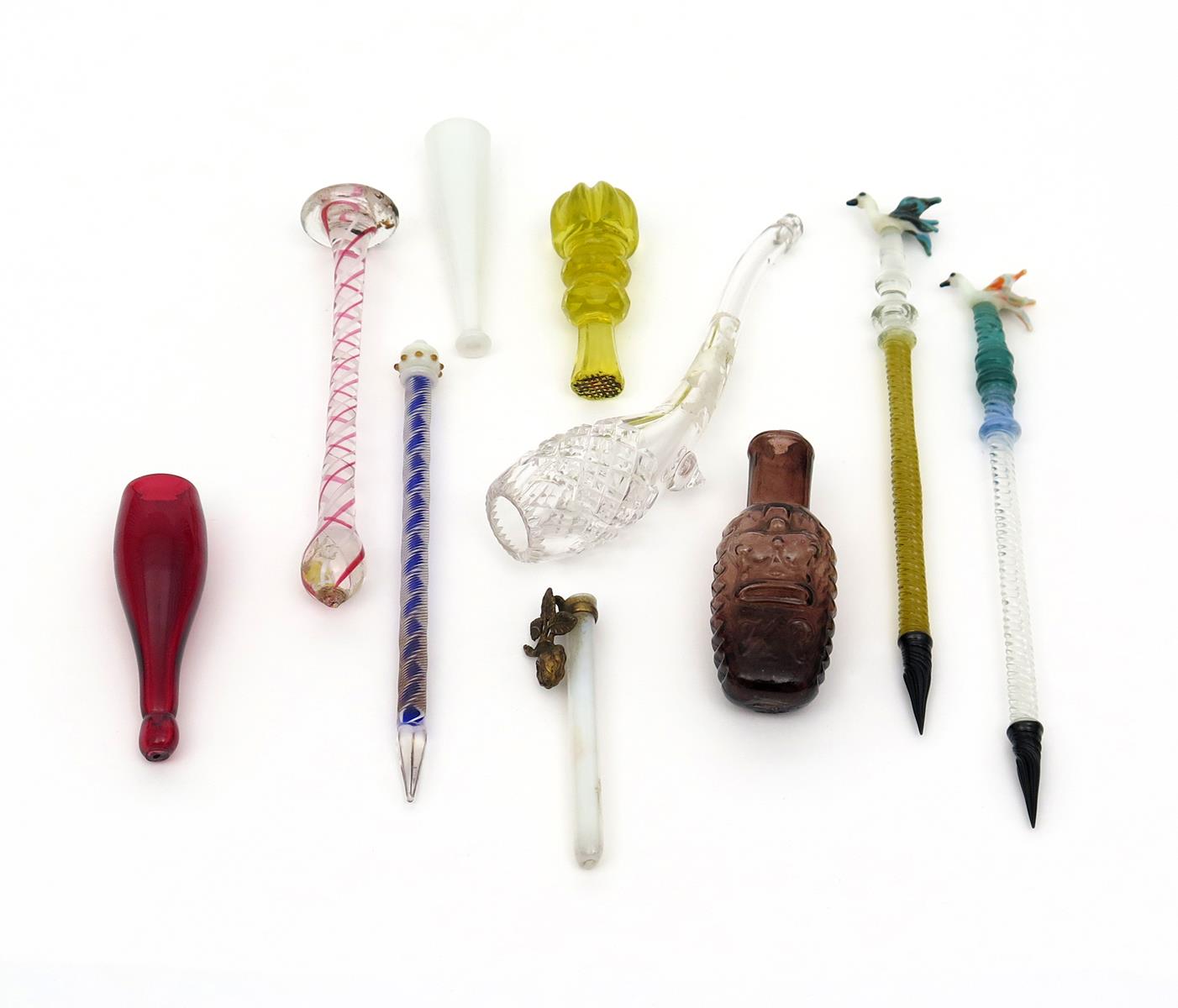 A small collection of glass toys and trinkets 19th century and later, including an amethyst glass scent bottle moulded with a rose and a crown, a cut glass pipe, an opaline glass posy holder and three Venetian glass pens, 17cm max. (10)