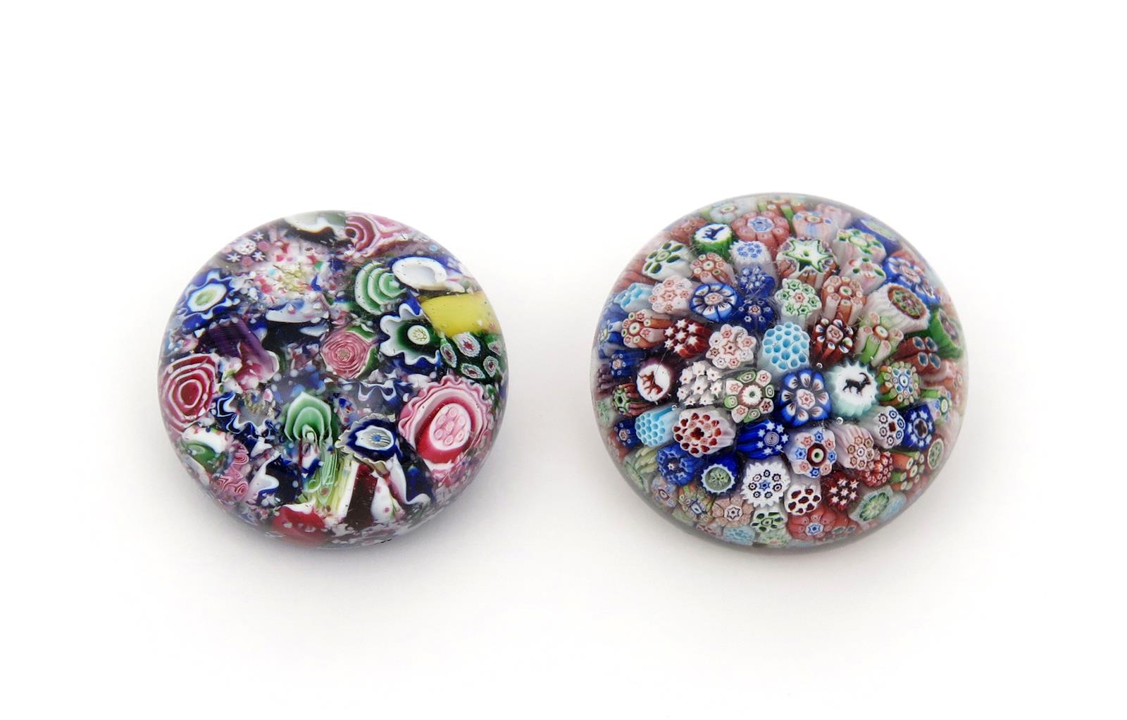 Two French miniature paperweights c.1860, one a Clichy scramble weight set with a jumble of canes including the Clichy rose, the other a Baccarat close-packed millefiori weight including several silhouette canes, some scratching, 5cm dia max. (2)