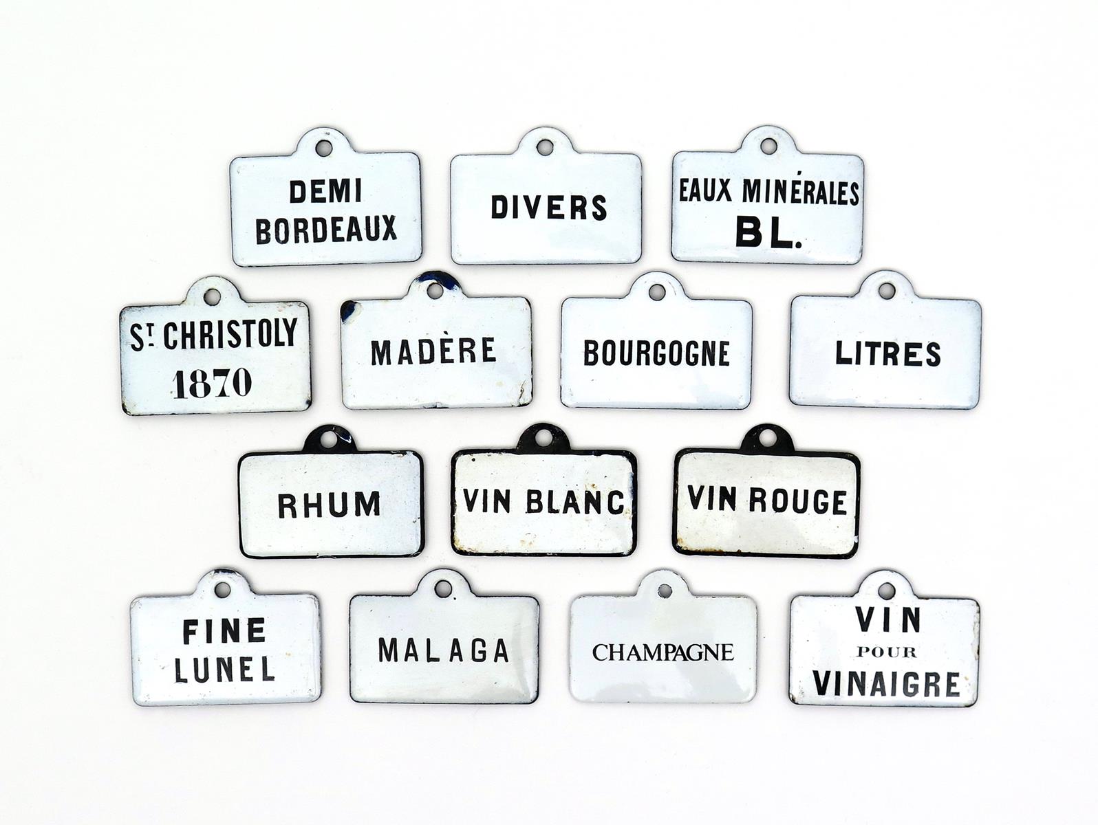 Fourteen Continental enamel bin labels 19th/early 20th century, the rectangular forms variously inscribed with the names of wines and spirits including 'Bourgogne', 'Malaga', 'Vin pour Vinaigre', 'Rhum', 'St Christoly 1870' and 'Fine Lunel', 7.3cm. (14)