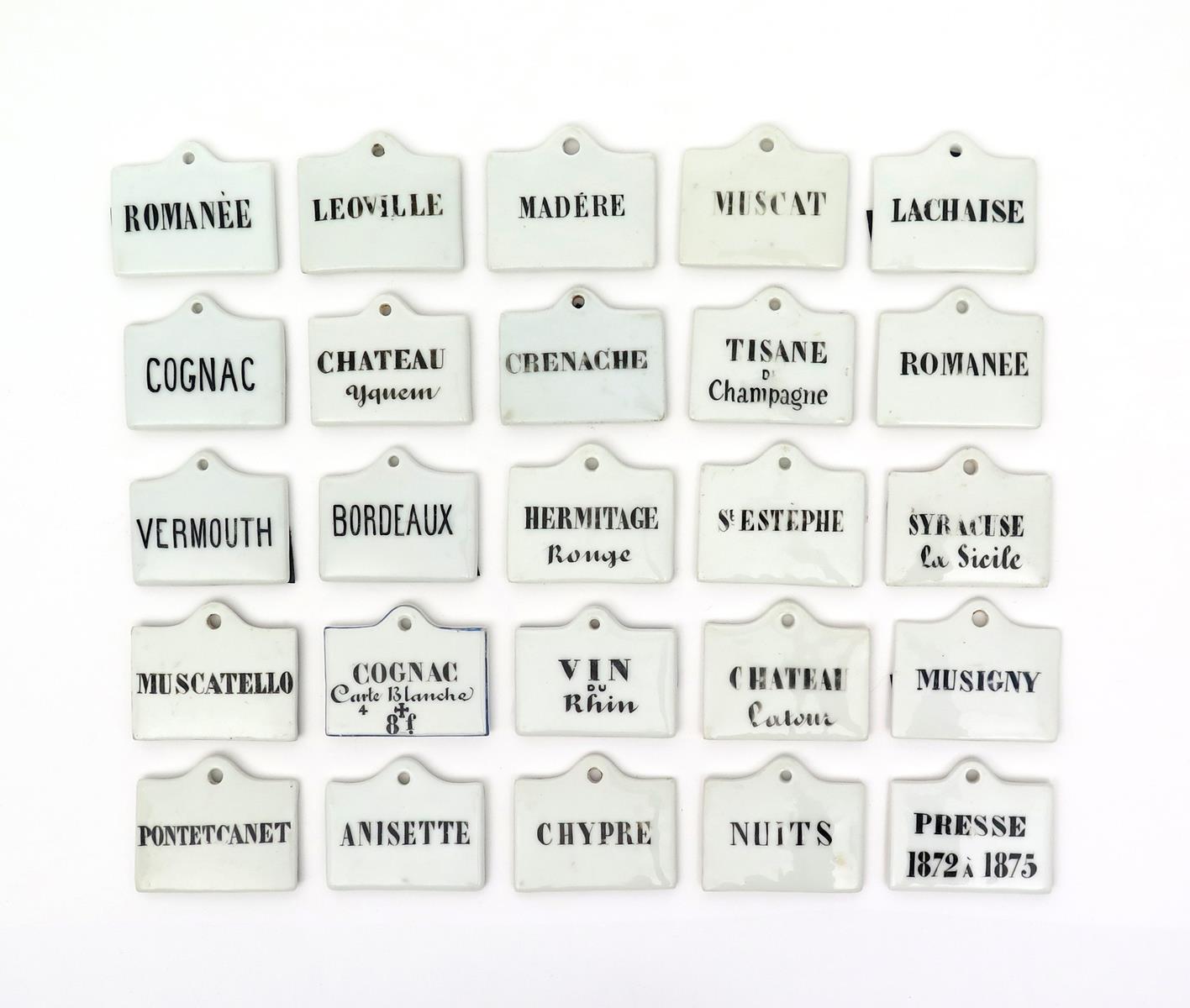 Twenty five Continental porcelain bin labels late 19th/early 20th century, of rectangular form, variously titled in black with different wines and spirits including 'Leoville', 'Chypre', 'Musigny', 'Muscatello', 'Crenache' and 'Hermitage Rouge', 7cm. (25)