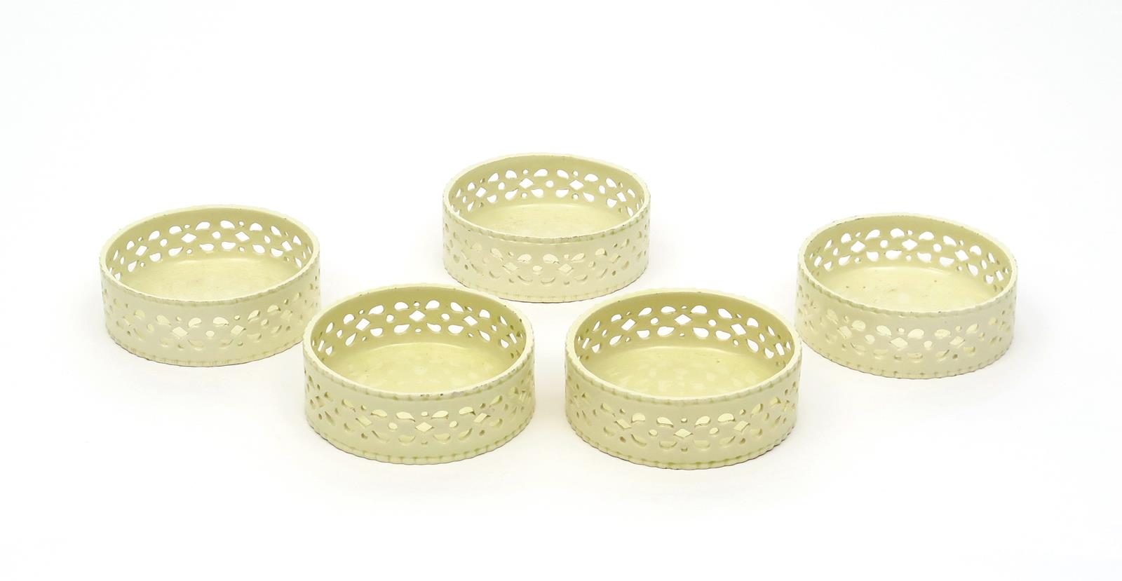 Five creamware bottle coasters c.1800, the cylindrical sides pierced with a continuous band of small shaped holes, with a moulded band to the rim and foot, 13.3cm. (5)