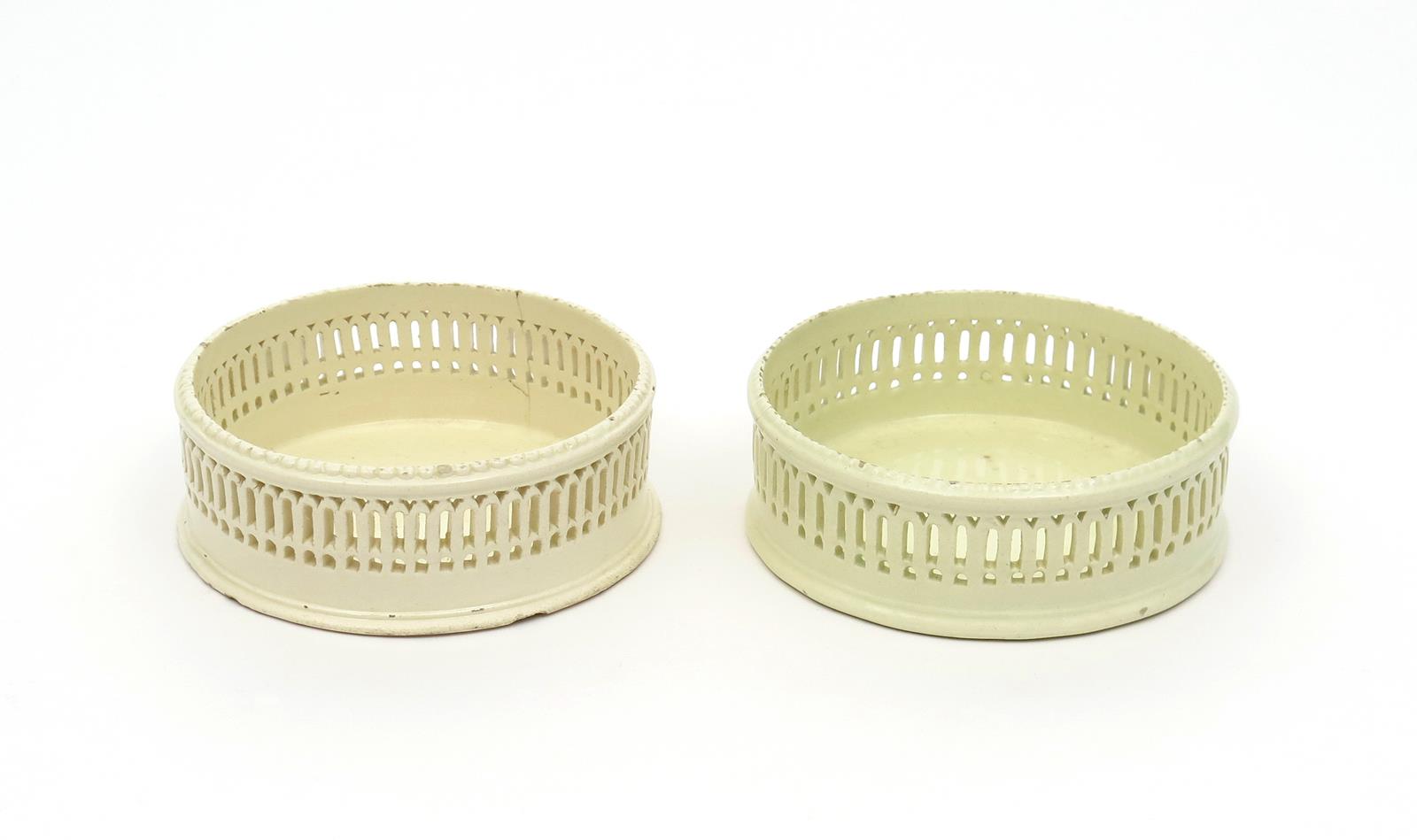 A large pair of creamware bottle coasters c.1780-1800, the sides pierced with a vertical panel design, the rim moulded with a band of beading, 14.5cm dia. (2)
