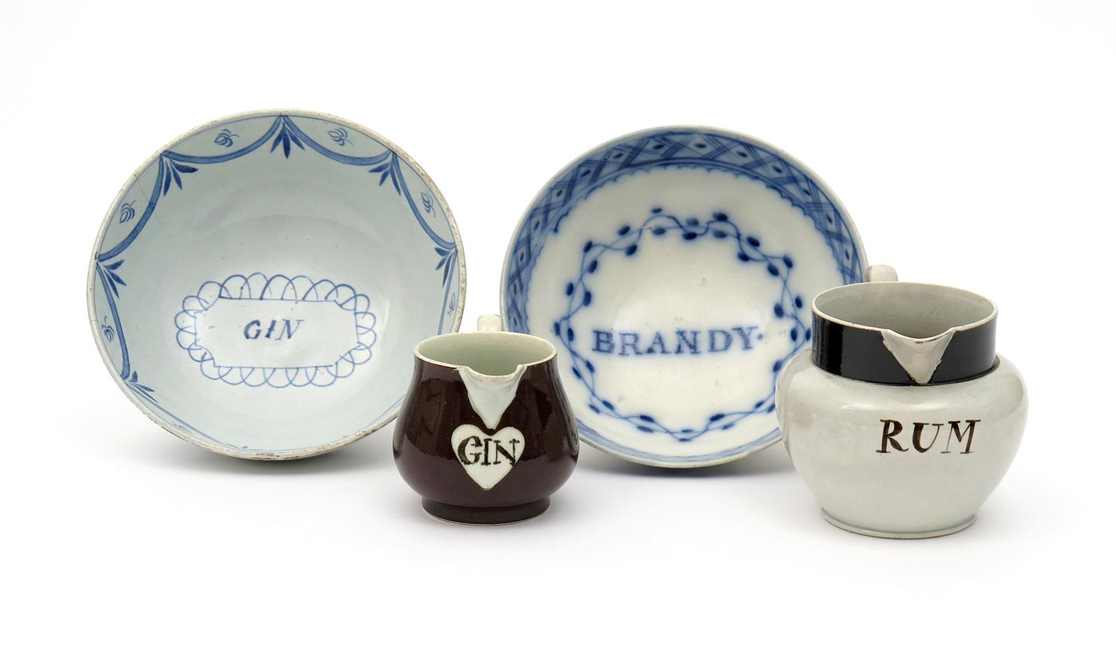 Two pearlware bowls and two small jugs 1st half 19th century, the bowls painted in blue and titled to the interior, one 'Gin', the other 'Brandy', the larger jug inscribed 'Rum' beneath a wide brown border, the smaller jug glazed brown with a reserved heart-shaped panel inscribed 'Gin', one bowl cracked, 16cm max. (4)