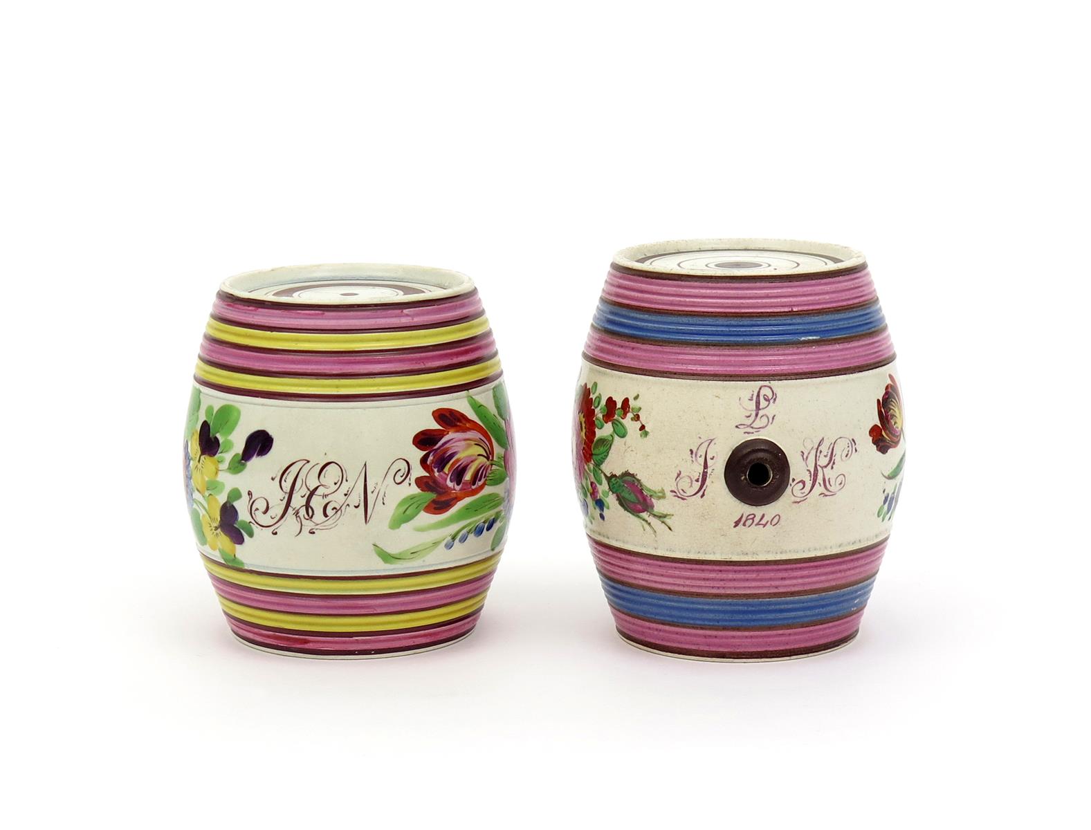Two pearlware spirit barrels c.1840, moulded with coopered bands to each end, painted with bold flower sprays, one inscribed 'LJK' above the date 1840, the other with the initials 'JEN', 12cm max. (2)