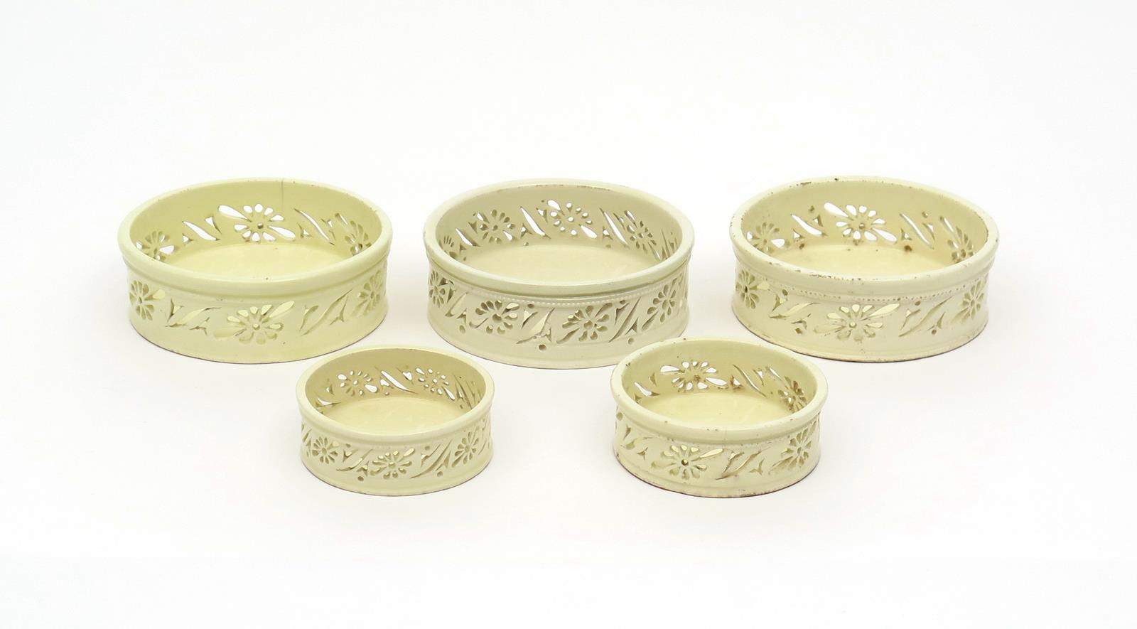 Three large and two small creamware bottle coasters c.1780-1800, the straight sides pierced with a continuous flowerhead design beneath a raised beaded band, 14cm dia max. (5)