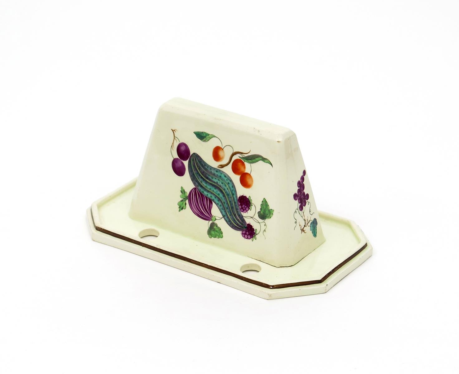 A small creamware jelly mould core late 18th century, of canted rectangular form, painted to four sides with sprays of fruit including strawberries, grapes, cherries, blackberries and a cucumber, 20.3cm across.