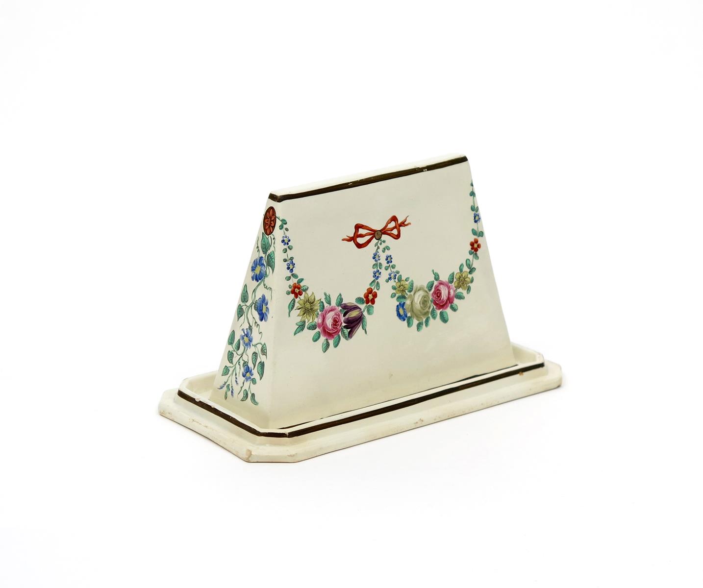 A Wedgwood jelly mould core c.1780, of canted rectangular form, painted with a continuous garland of flowers suspended from tied red ribbons and floral roundels, edged in brown, impressed mark, minor faults, 22cm across.